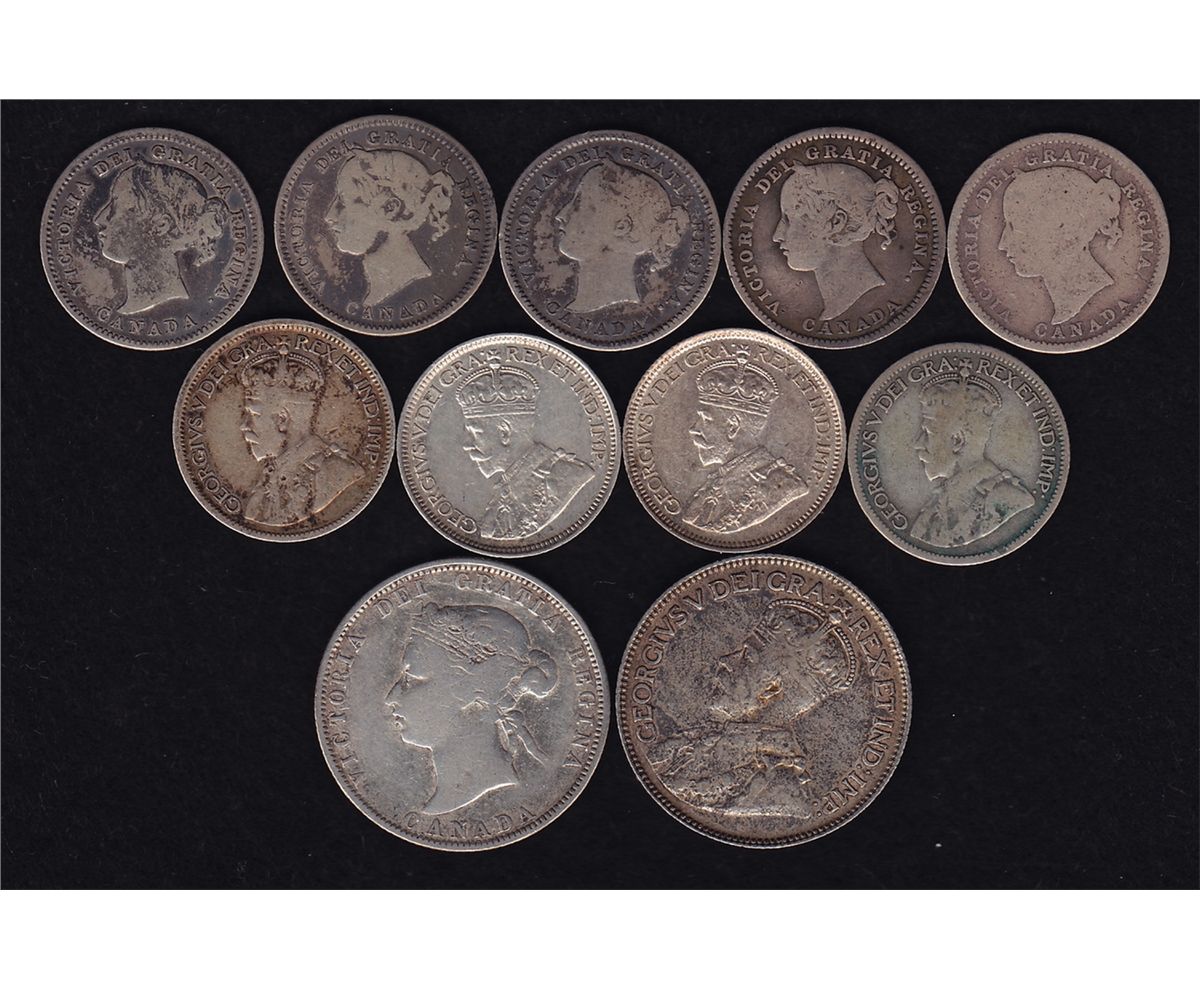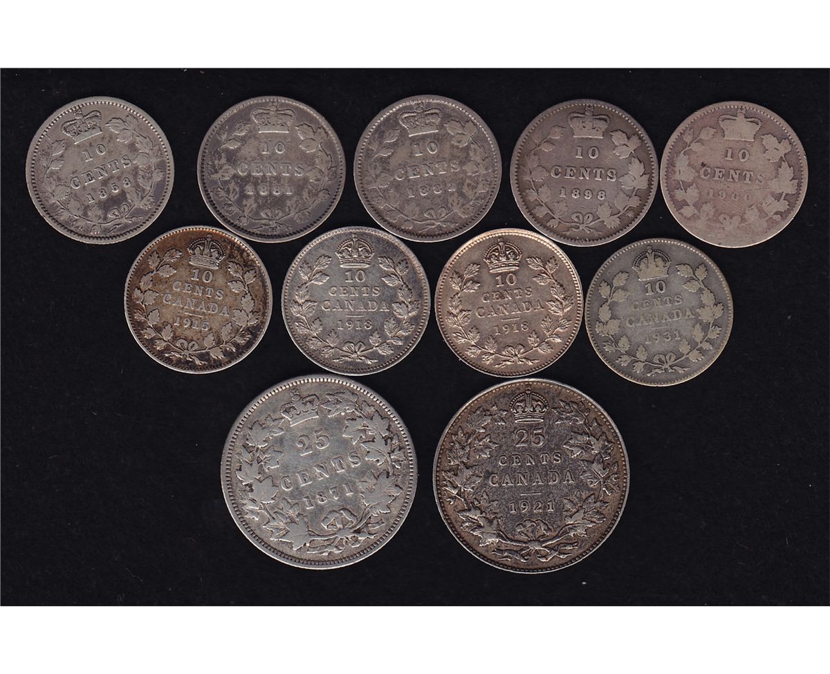 Canadian Decimal Lot - Includes: 1858, 1881H, 1882H, 1898, 1900, 1915, 1918 (2), 1931 Ten Cents. 1871, 1921, Twenty Five Cents. We recommend viewing this lot, conditions vary, no return. 11 Pcs.