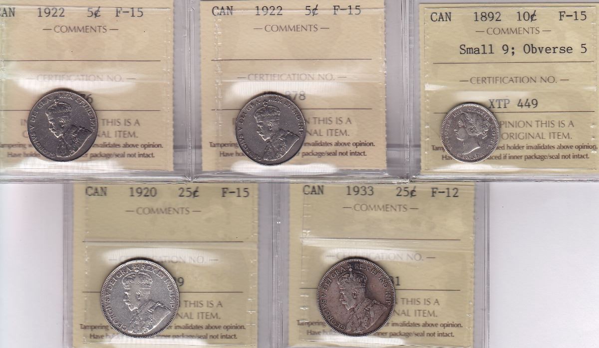Canadian Decimal Lot of 5 - 1922 5 Cents ICCS F-15 (2); 1892 Obv 5 Sm9, 10 Cents ICCS F-15; 1920 25 Cents ICCS F-15; 1933 25 Cents ICCS F-12. 5 Pcs.