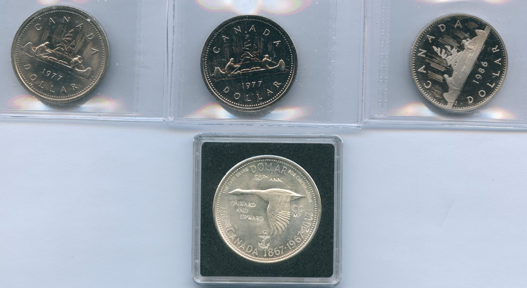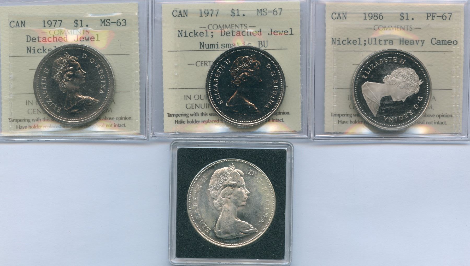 Includes: 1967 Silver Dollar with Counterstrikes, only 200 struck. 2 x 1977 ICCS graded & 1986. 4 pcs.