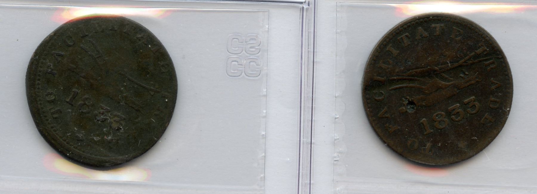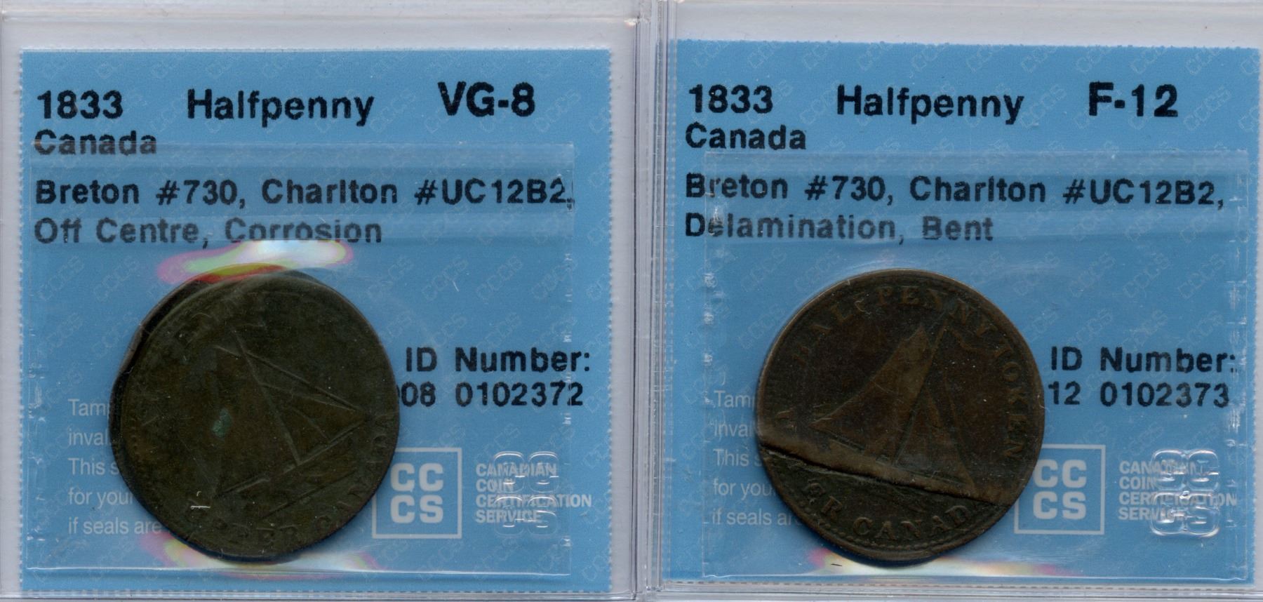 Canadian ERRORS - Pair of 1833 Halfpenny errors (Br-730), one is struck 10% off centre, CCCS VG-8 and the other is lamination error (retained), CCCS F-12.
