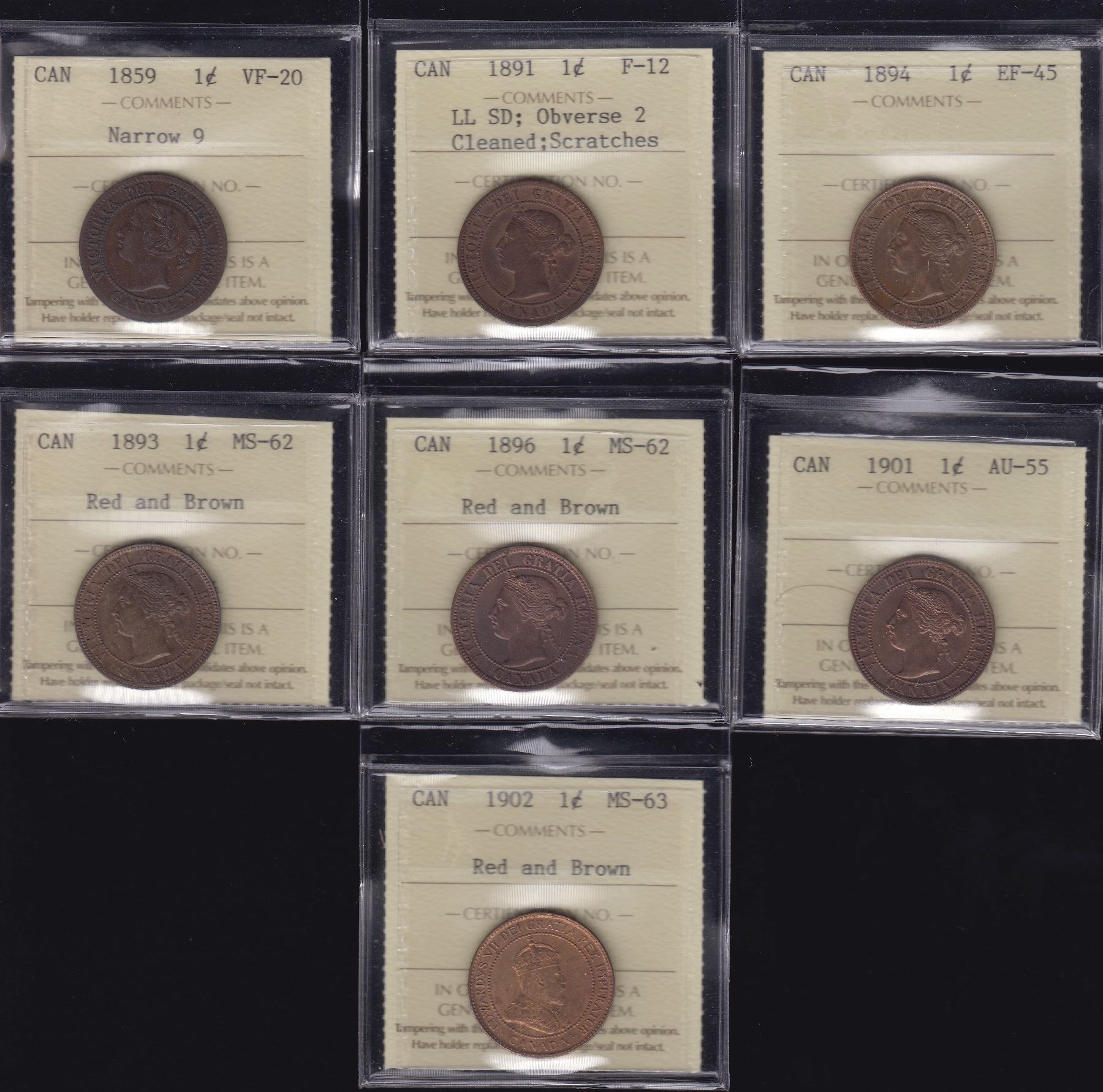 Lot includes: 1859 VF-20, Narrow 9. 1891 F-12. LL SD; Obv.#2 - cleaned, scratches. 1894 EF-45. 1893 MS-62 R&B. 1896 MS-62, R&B. 1901 AU-55. 1902 MS-63, R&B. 7 Pcs.