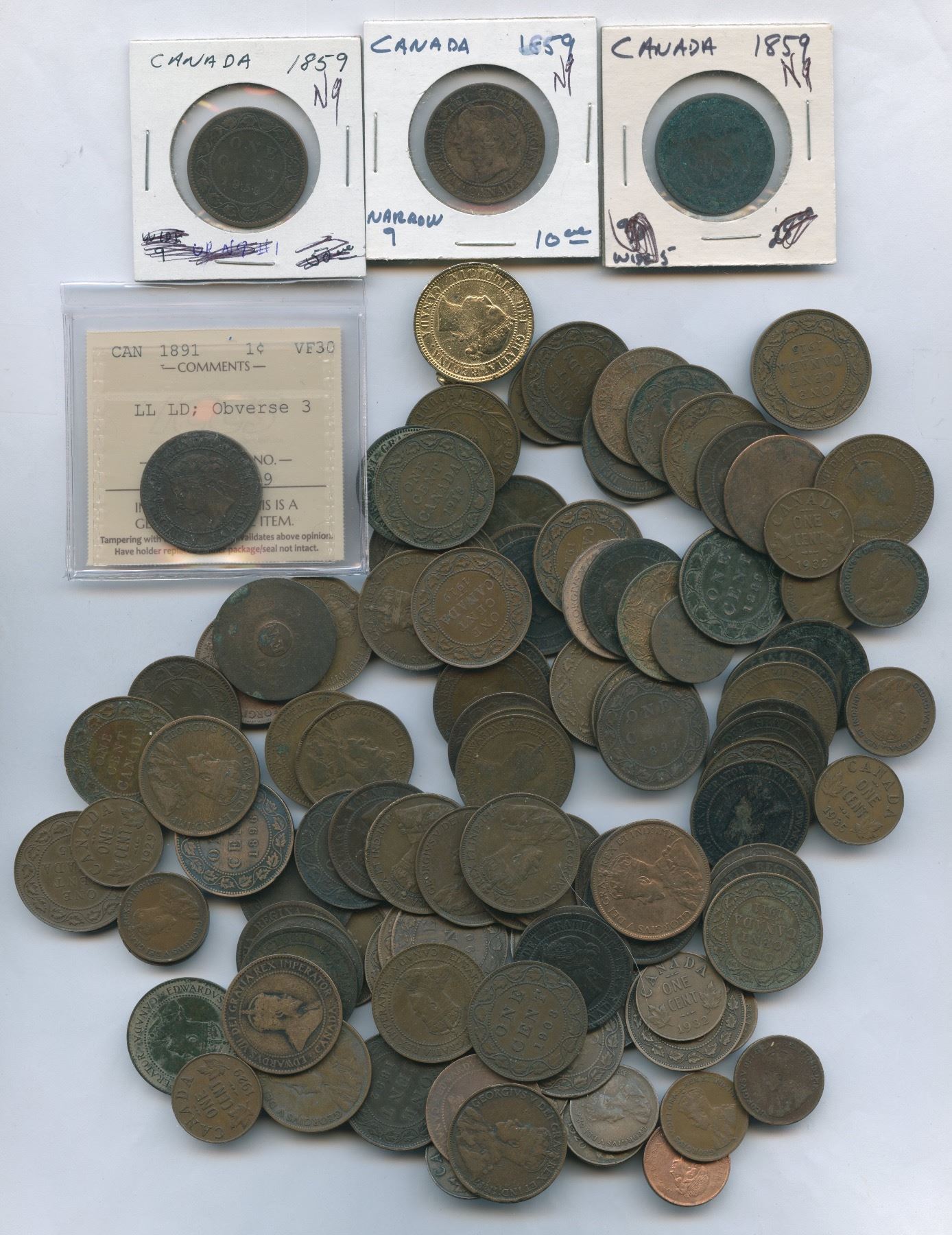 Mainly large cents, great wholesale lot with many 1859 examples to study. 203 pcs.