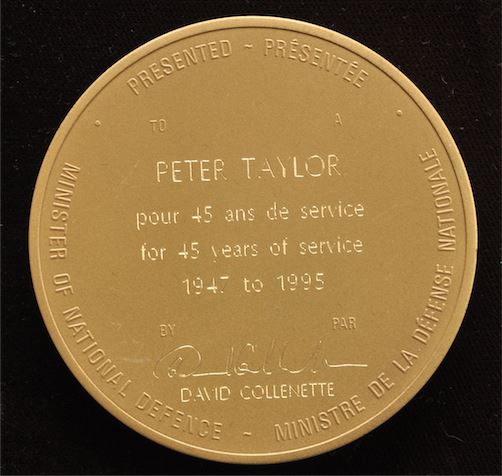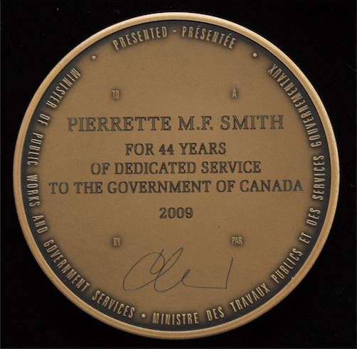 Long service Canadian Government medals Includes: goldine covered bronze, 75mm, Presented by the Minister of National Defence David Collenette to Peter Taylor for 45 years of service, in case of issue; AE, 75 mm. Presented by the Minister of Public Works and Government Services to Pierette M.F. Smith for 44 years of dedicated service, in case of issue. 2 Pcs.
