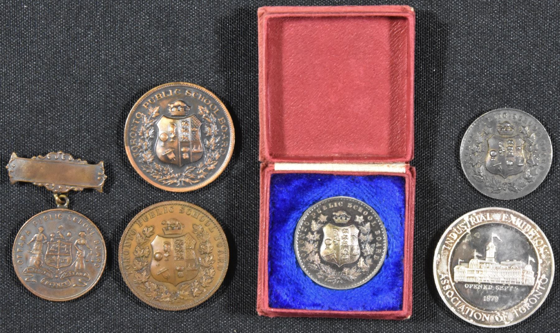 Canadian National Exhibition, 1978 Centennial silver souvenir, 31.5g; bronze Ottawa School Board (Punctuality and Good Conduct medal); Toronto School Board bronze medals (2) for Good Conduct, etc.; Toronto School Board, 8 year silver medal in case of issue for Good Conduct, etc. and an 8 year piece in white metal. Lot of 6 Pcs.