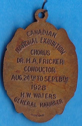 Canadian Medal - 1928 Canadian National Exhibition Chorus medal. The inscription on the back are: CANADIAN/NATIONAL EXHIBITION/CHORUS/DR H.A. FRICKER/CONDUCTOR/AUG.24th TO SEPT.8th/1928/H.W. WATERS/GENERL MANAGER/LACKIE MFG CO. The Exhibition Chorus made up of about 1,000 voices, performed from 1922 till 1934. EF.