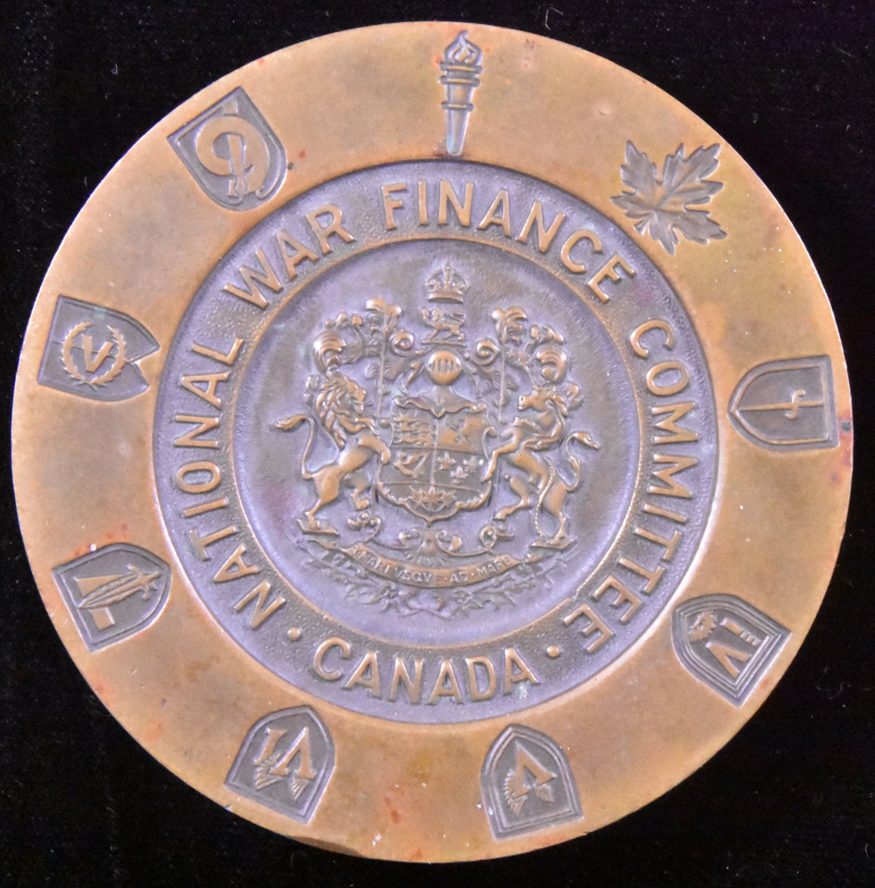 War Finance Committee presented to A.H. Williams. in Recognition of Service (French). This committee was responsible for overseeing 9 patriotic "Victory Loan" drives conducted between 1941 and 1945. Engraved by Thomas Shingles of the Royal Canadian Mint. Scarce, bronze, 379 gms.