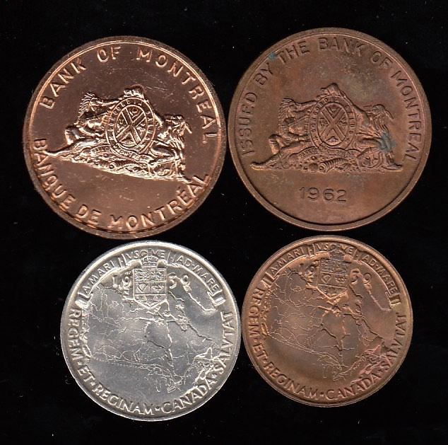 Canadian Medals - Lot of Four - Includes: Official Commemorative Medal Royal Canadian Mint 10c 1939 Royal Visit in copper and silver. 2 x Bank of Montreal commemorative medals (1962 & 1963). 4 Pcs.