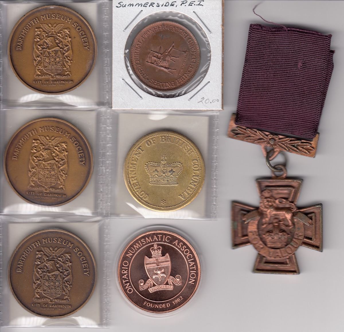 Canadian Medals - Lot of Seven - Replica of the Victoria Cross, Replica of the $20 British Columbia gold, ONA Waterloo Coin Club, 2013 copper, Summerside Journal Pioneer copper 1965, 3 Dartmouth Museum Society 1967 Centennial specimens. 7 Pcs.