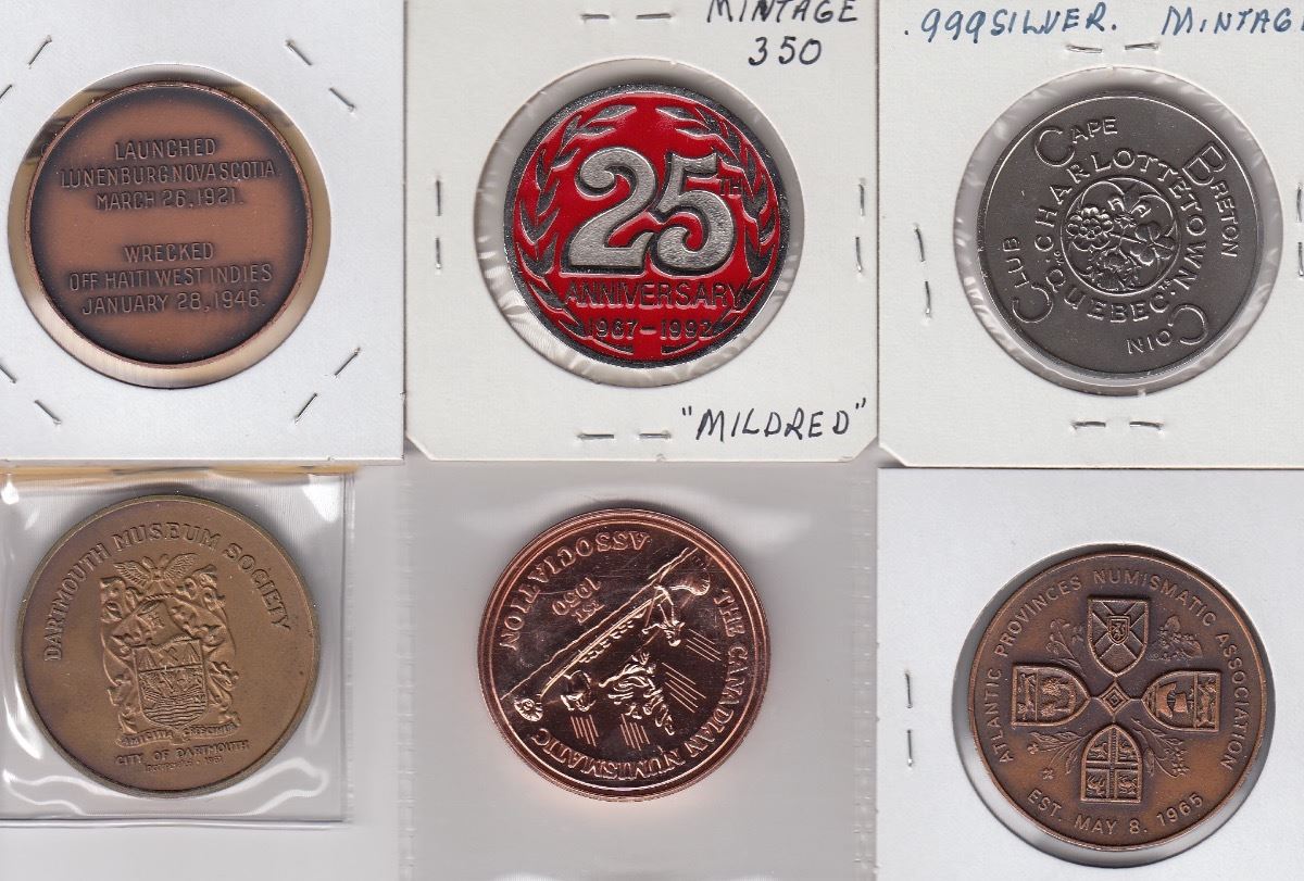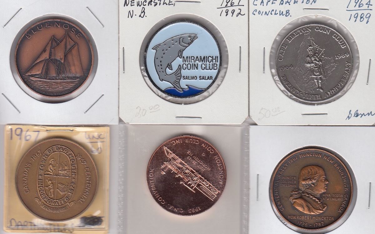 Canadian Medals - Lot of Six - NS Bluenose 1946 copper, 1967 copper Moncton Coin Club Centennial, 1983 CNA Moncton copper, 1967 Dartmouth Centennial, 1992 Miramichi Coin Club enamelled, 1989 silver Cape Breton Coin Club. 6 Pcs.