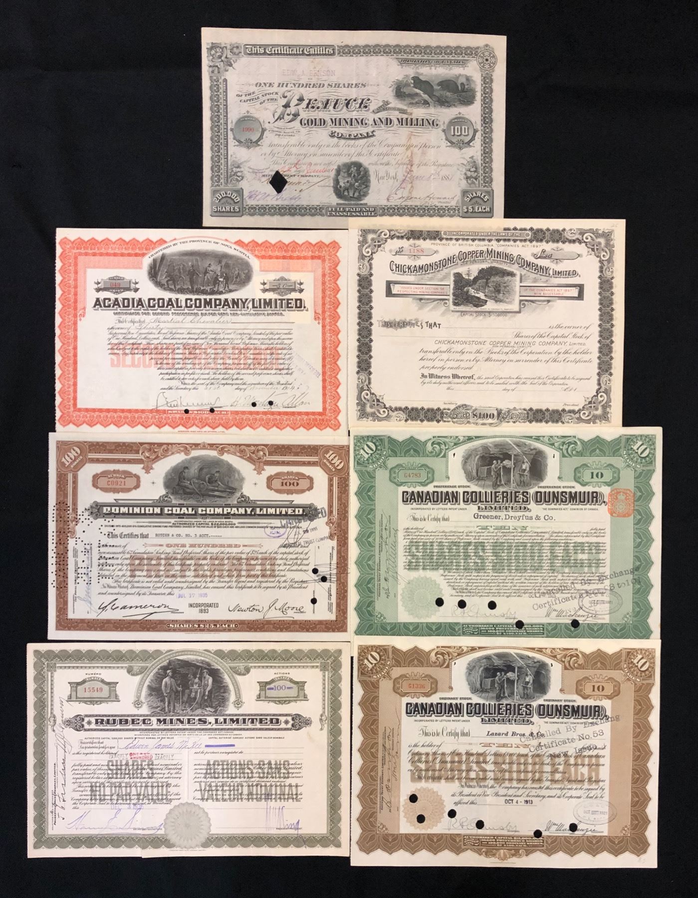 Canadian Mining Share Certificates: Acadia Coal Co.; 1914, Dominion Coal, 1935; Chickamonstone Copper Mining, Br. Columbia, remainder; Canadian Collieries, Dunsmuir, 1913, two different; Beauce Gold Mining and Milling, 1881, with two vignettes, the lower one also occurring on all Bank of Nova Scotia $10 notes; Rubec Mines, 1936, has a tear at bottom. All seven documents have at least one vignette; most are printed by CBNCo or ABNCo.