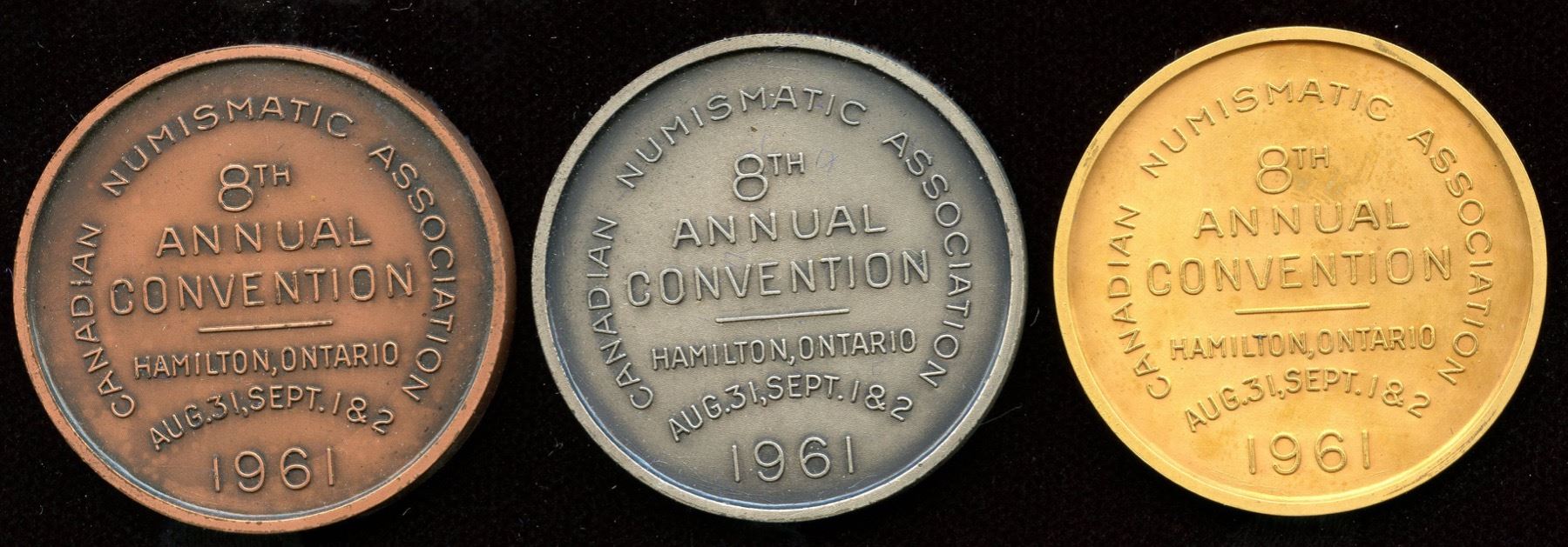 Canadian Numismatic Association - Hamilton, 1961, set of three, gold-filled, silver and bronze in case of issue.