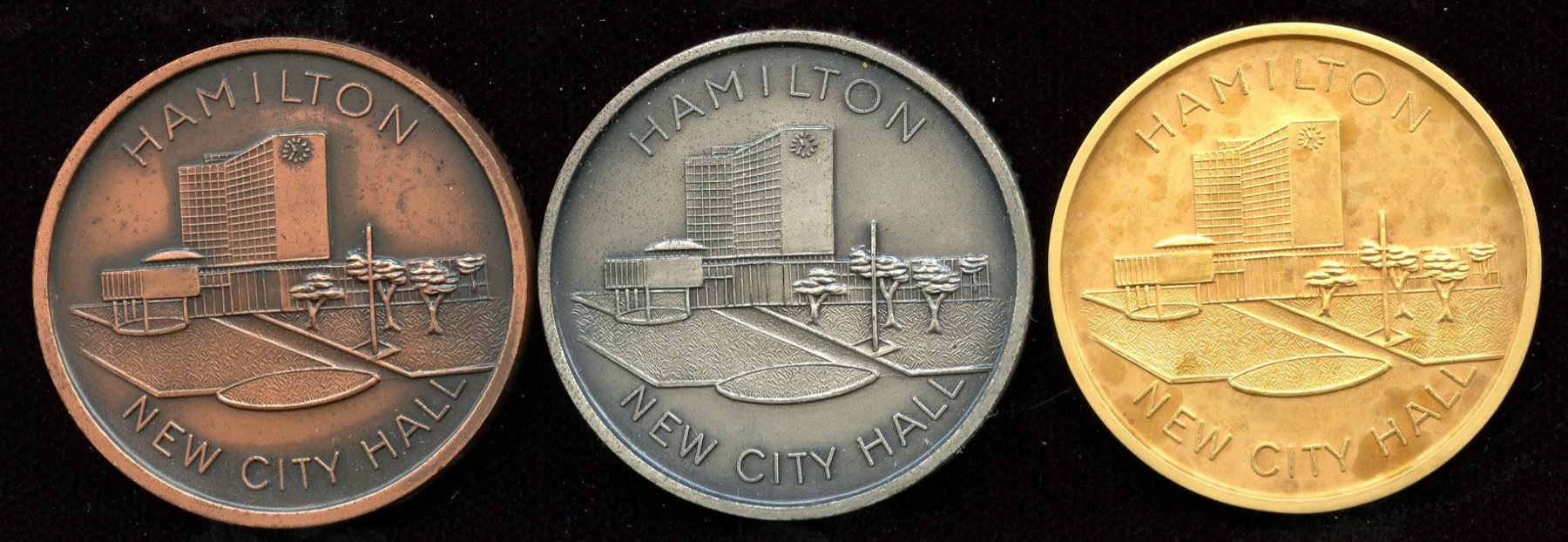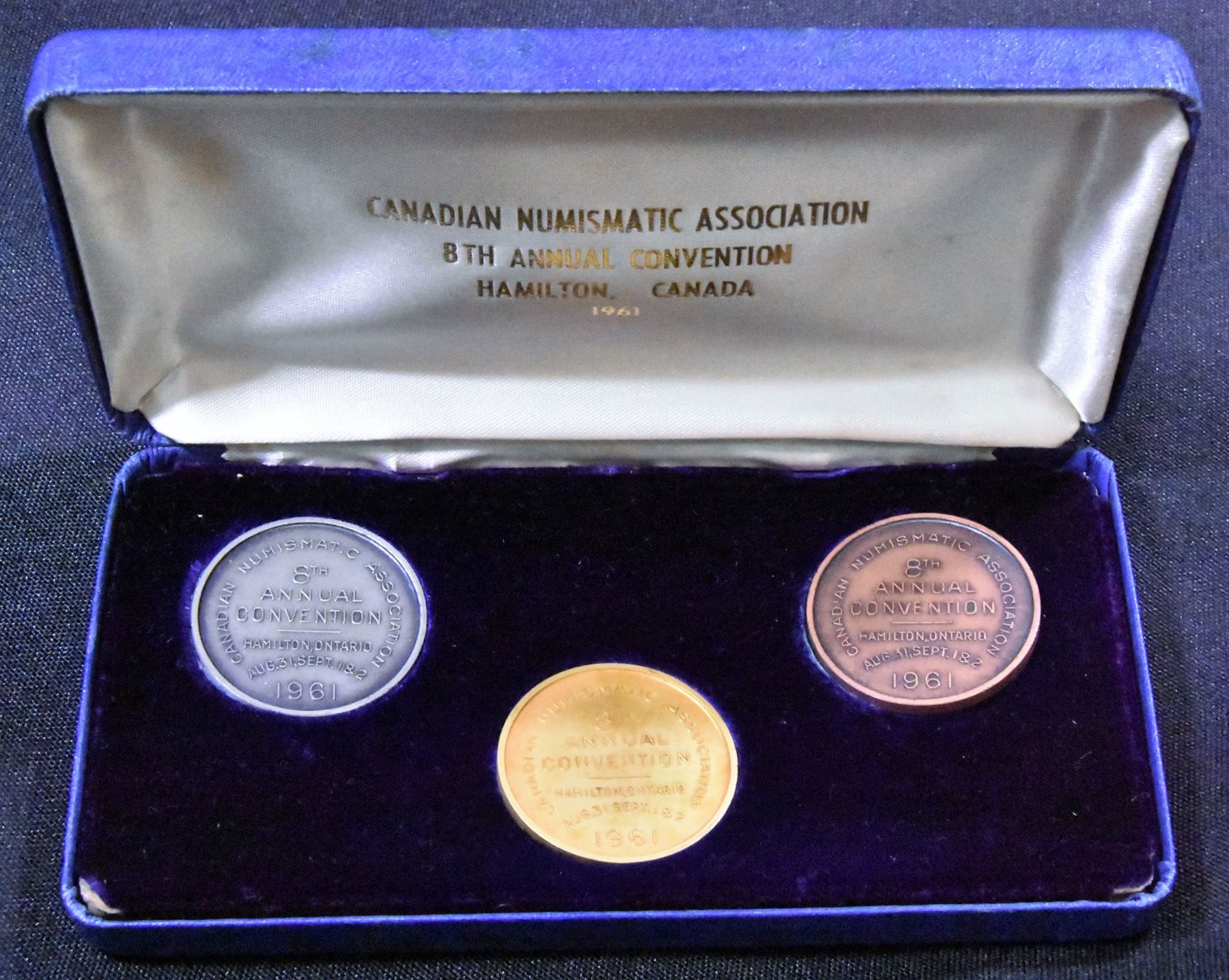 Hamilton, 1961, set of three, gold-filled, silver and bronze in case of issue.