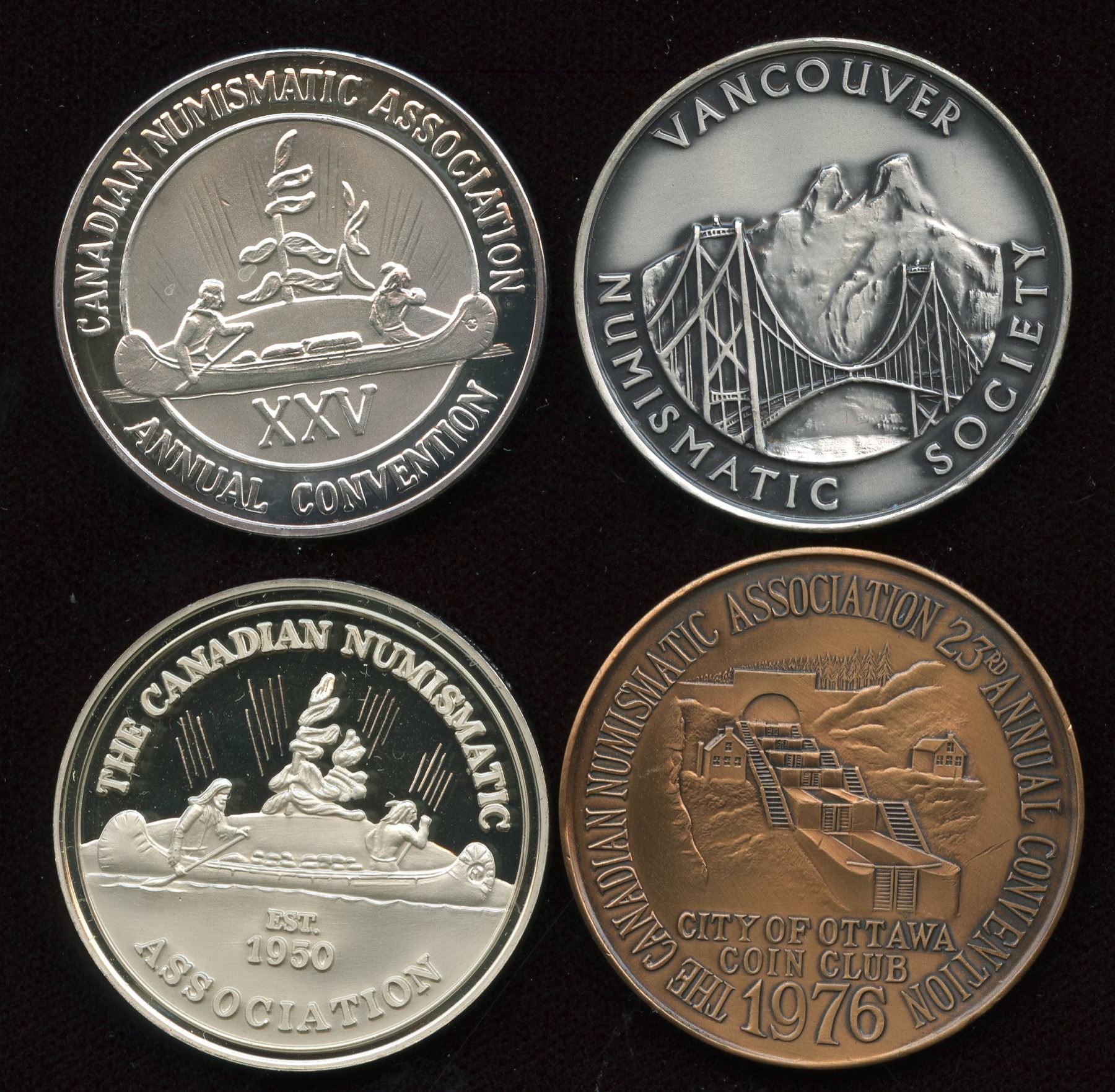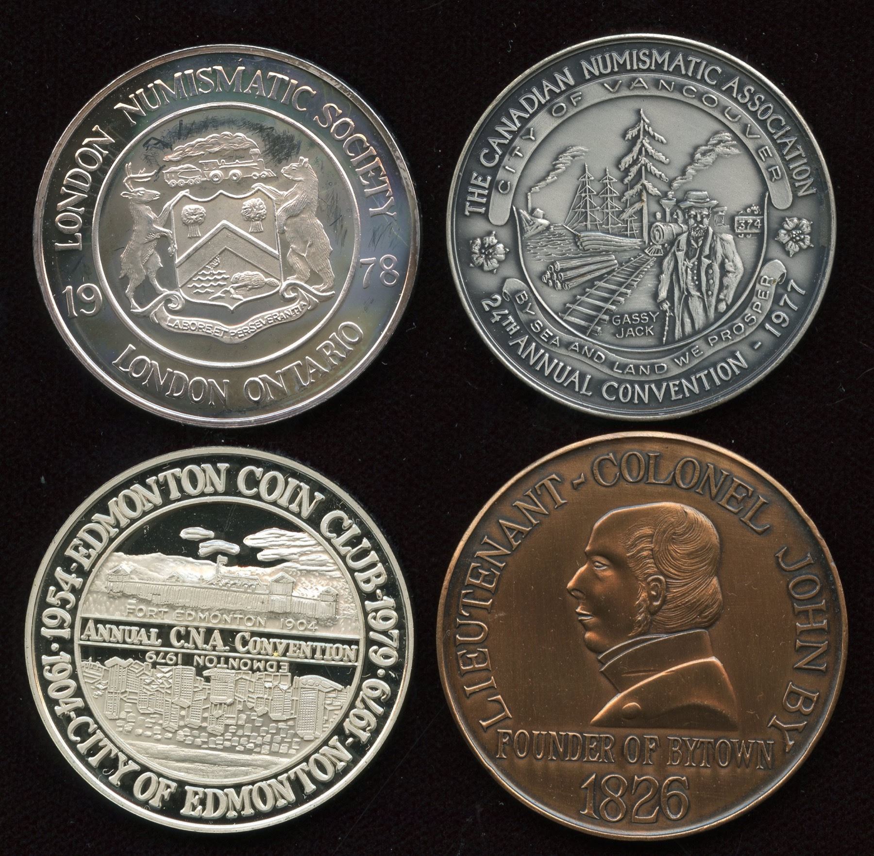 Ottawa, 1958, bronze, 300 issued; Vancouver, 1977, silver, 75 issued; London, 1978, silver, 75 issued; Edmonton, 1979, silver, 100 issued. 4 Pcs