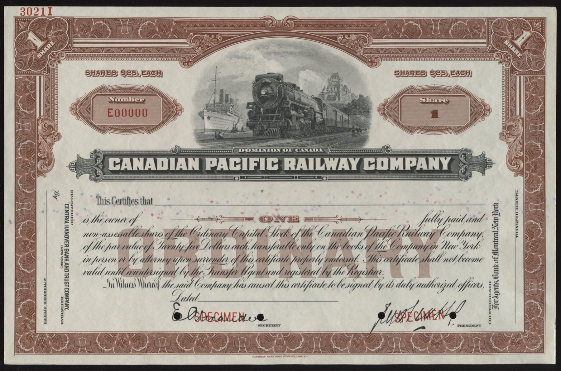 1 share Brown EF SPECIMEN #E 00000 train, ship and Chateau Frontenac hotel. Specimens from this well known company are seldom released to the public and are almost unknown to collectors. This would make an excellent addition to any railway collection.