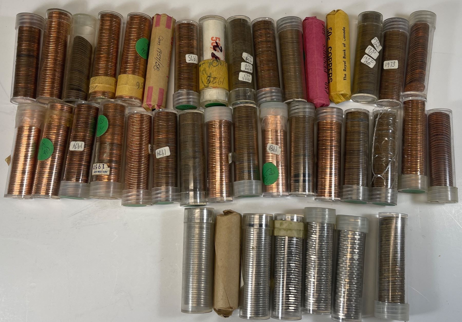 32 penny rolls and 7 nickel rolls. Some are original, many are put together from bags and a few are incomplete. Viewing is recommended. 39 rolls.