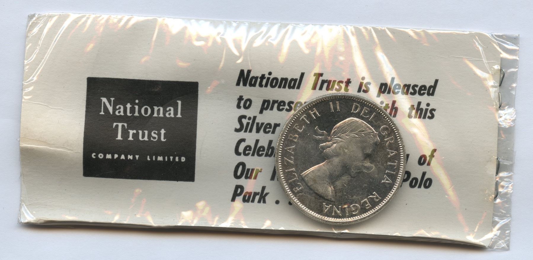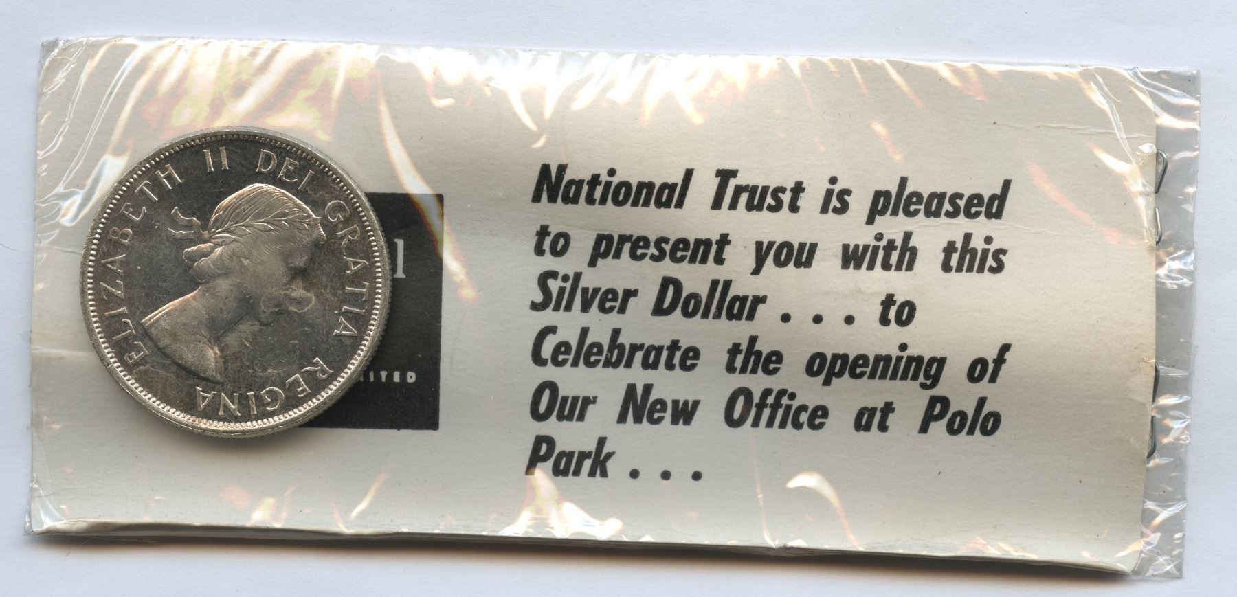 Package reads: "National Trust is pleased to present you with this Silver Dollar....to Celebrate the opening of Our New Office at Polo Park...