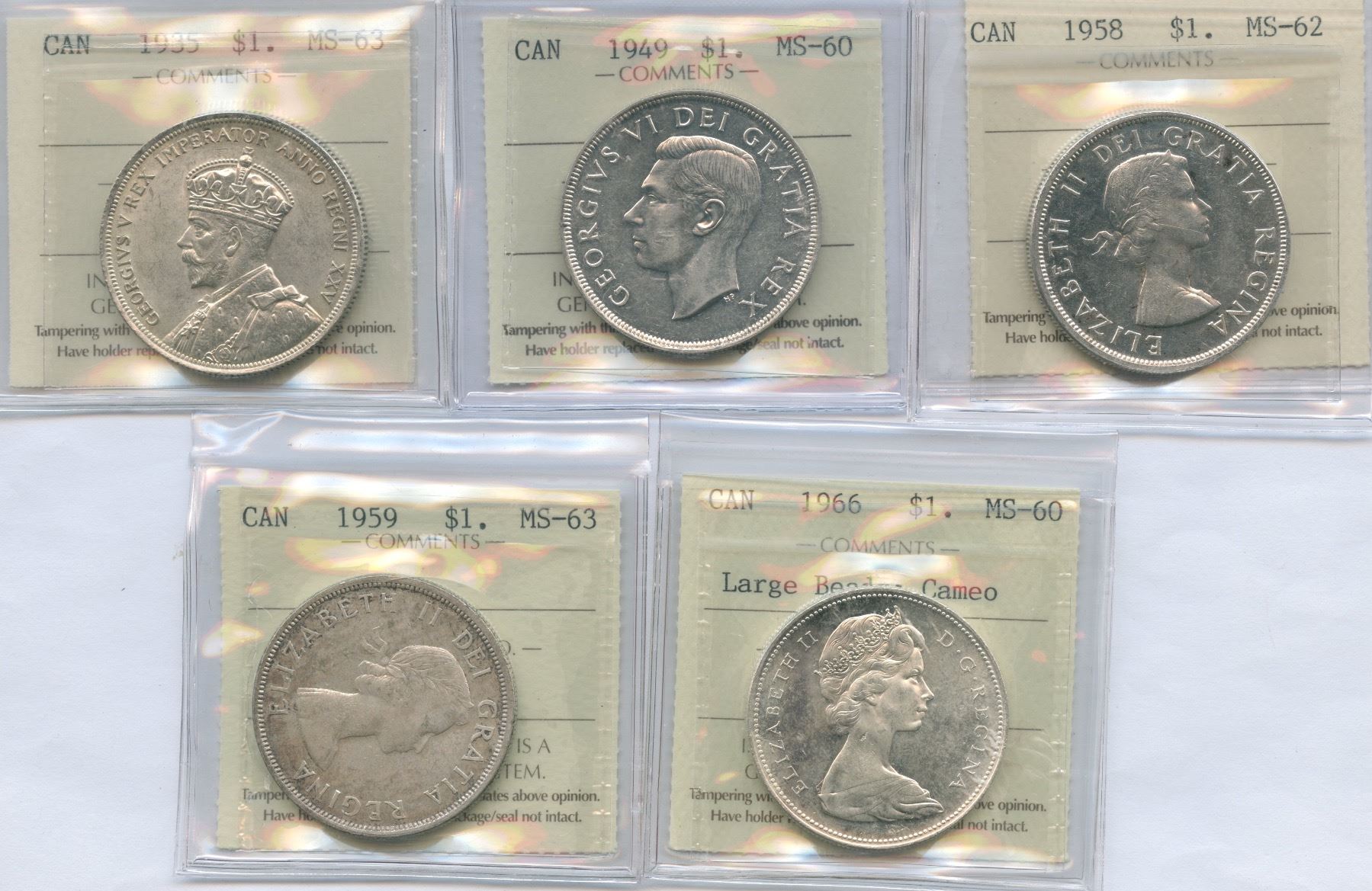 Includes: 1935 MS-63. 1949 MS-60. 1958 MS-62. 1959 MS-63. 1966 Large Beads, Cameo, MS-60. 5 Pcs.