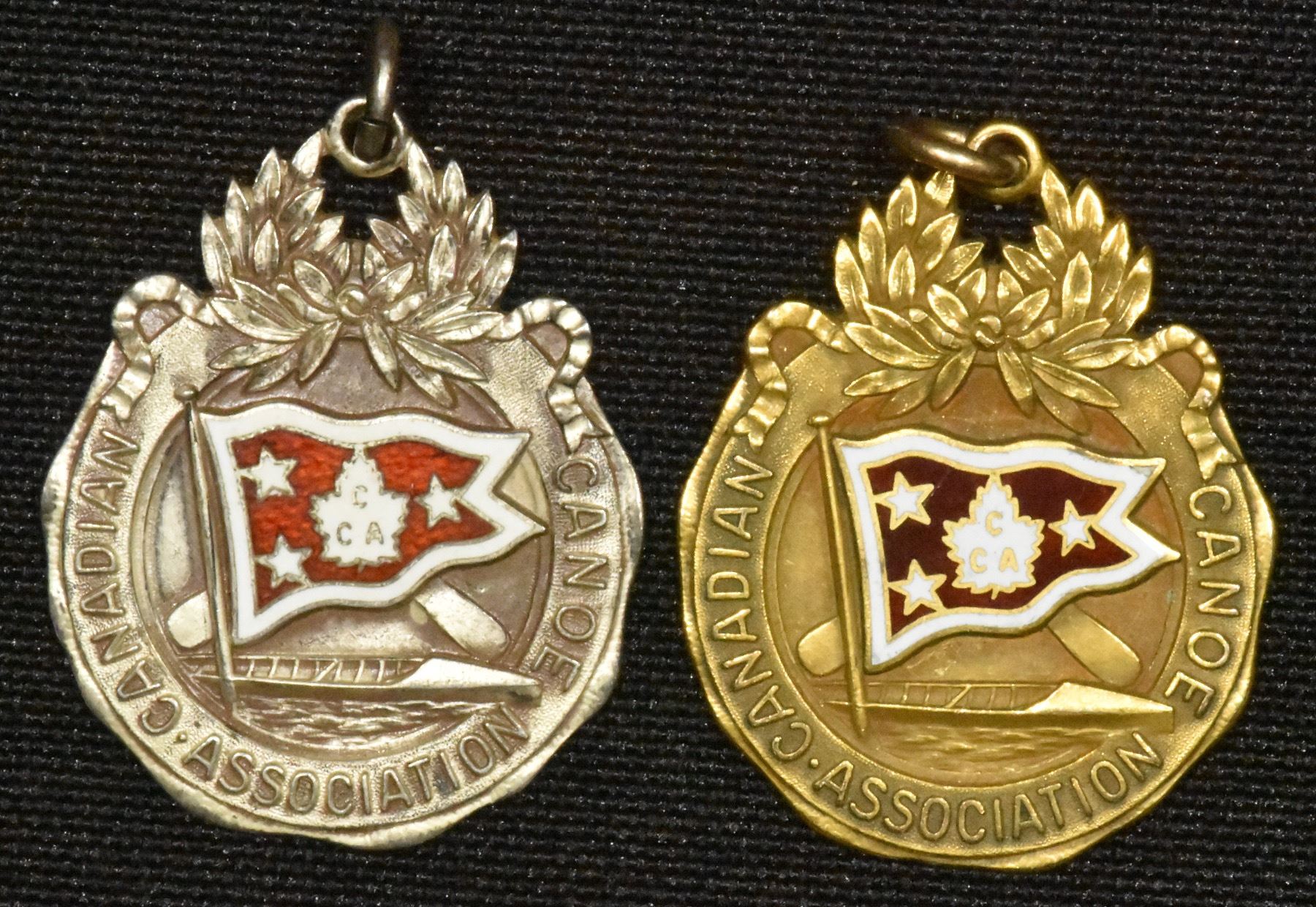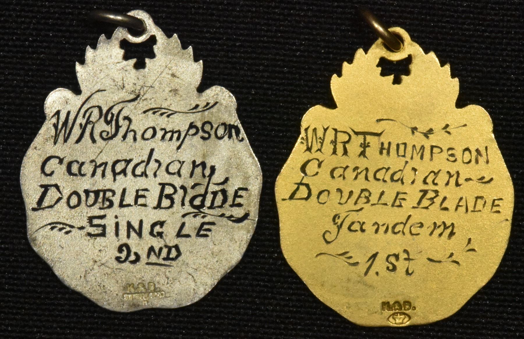 Two canoeing medals issued to W.R. Thompson, first gold filled for "1st Double Blade Tandem"; the second silver for "2nd Double Blade Single". Beautifully designed with each having a loop at 12 o'clock.