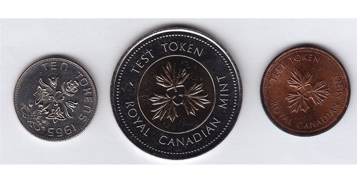 Test Token Lot Includes: CH TT-1.3C Round, Maple Leaves, with beads (1979). Copper, English/French legend. 1.4mm thickness, 19.0mm diameter, non-magnetic, 2.8gms; CH TT-10.2B - Round, Bouquet of Flowers and Fleur-De-Lis, obv. & rev. TEN TOKENS 1965, 1.2mm thickness, 17.8mm diameter, magnetic, 2.1gms; CH TT- 200.3 Round, Nickel ring; copper aluminum nickel centre. Obv. TEST TOKEN / ROYAL CANADIAN MINT, rev. EPREUVE / MONNAIE ROYALE CANADIENNE. 1.7mm thickness, 28.0mm diameter, magnetic, 7.3gms. 3 Pcs.