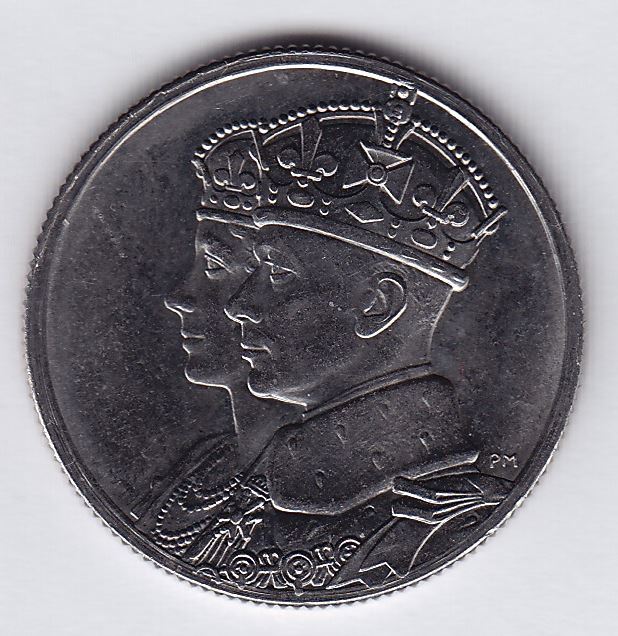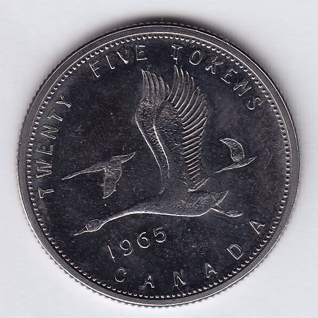 Twenty Five Cents CH TT-25.10B, Round, conjoined busts of King George VI and Queen Elizabeth with three Canada geese, 1965. Copper nickel, non-magnetic, reeded. 24.0mm diameter, 1.40 thickness, 5.10gms.