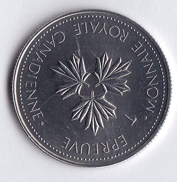Twenty Five Cents CH TT-25.13A, Round, three maple leaves, raised T on obv. & rev. Aluminum, 23.86 mm diameter, 1.58mm thickness, 1.48gms. Ex Hoare Sale #67, lot 263.