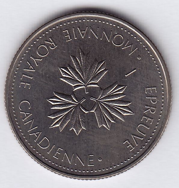 Twenty Five Cents CH TT-25.16A, Round, three maple leaves, raised I on obv. & rev. Copper nickel, non-magnetic, 23.76mm diameter, 1.58mm thickness, 5.04gms. Ex Hoare Sale #67, lot 260.