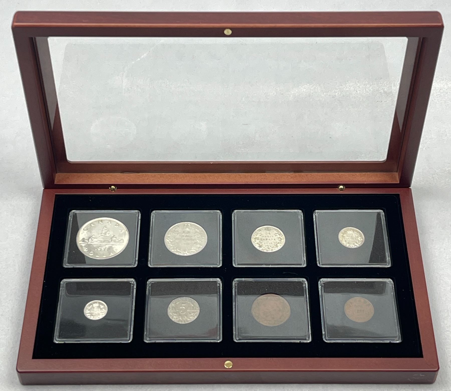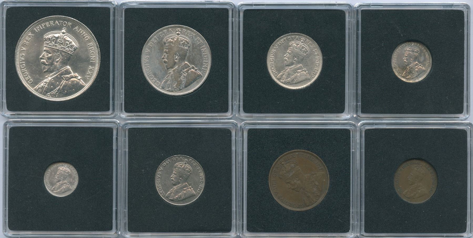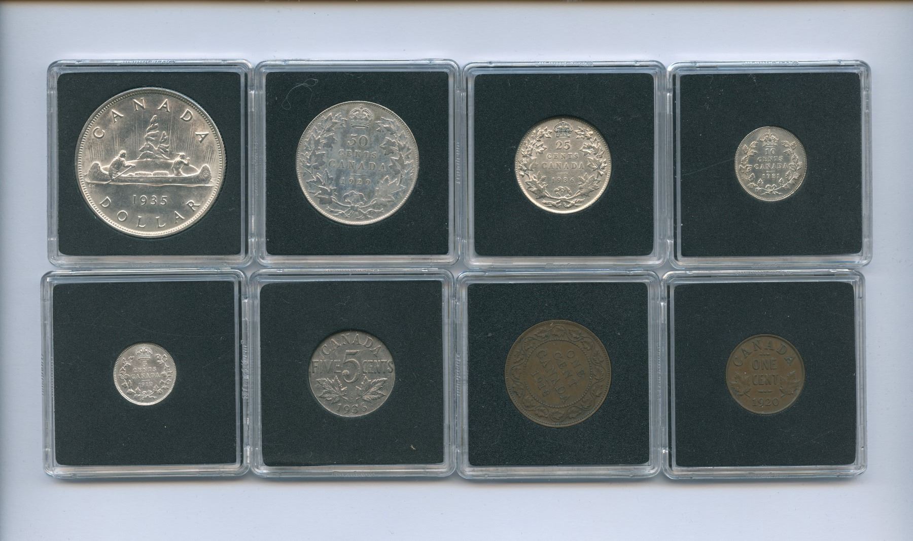 Includes: 1920 One Cent, 1918 Large Cent, 1936 Five Cents, 1912 Silver Five Cents, 1931 Ten Cents, 1936 Twenty-Five Cents, 1929 Fifty Cents, 1935 Silver Dollar. 8 pcs.