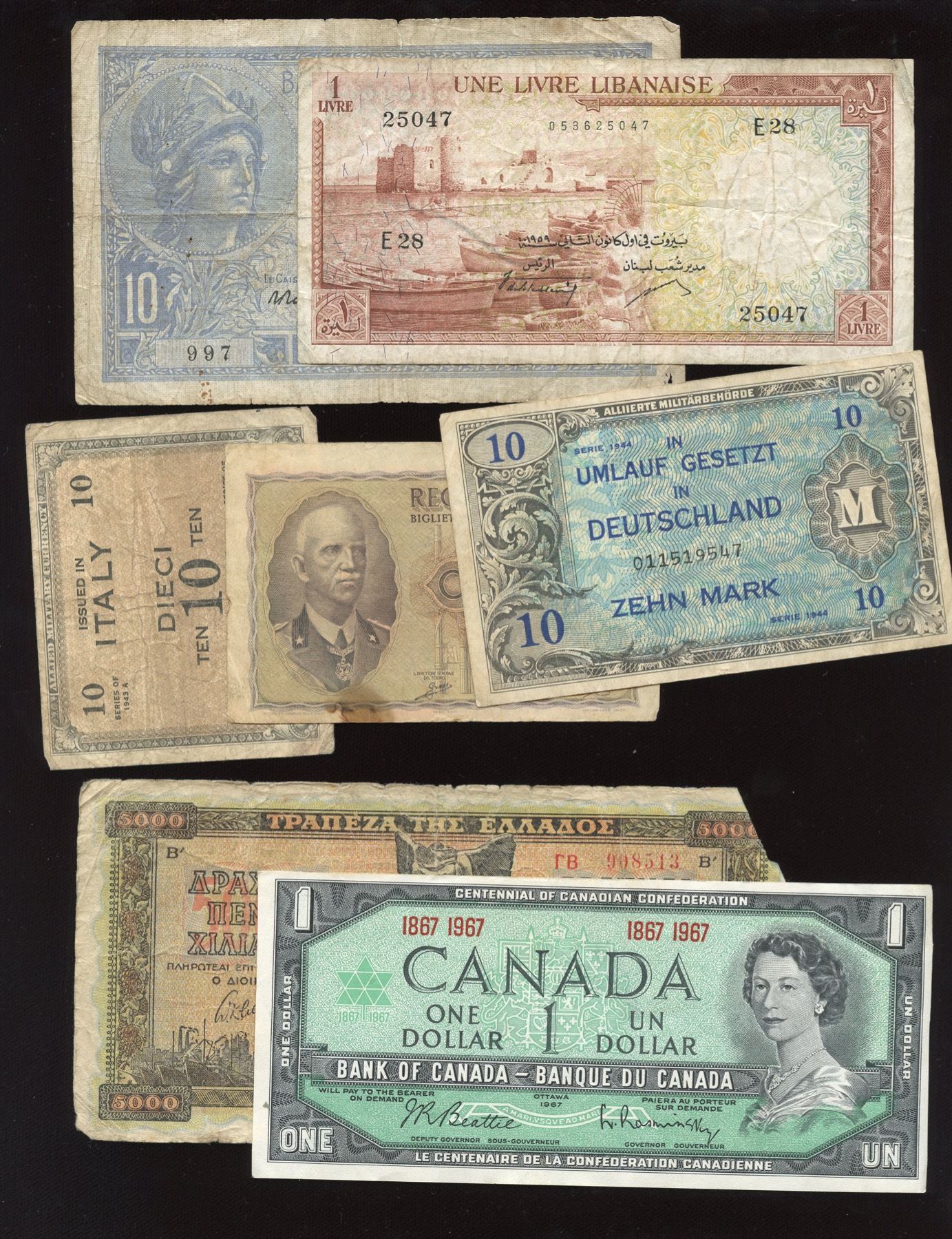 Includes: 7 Banknotes. 1807 Great Britain 1/2 Penny. Canadian: 1904, 1918 Five Cents. Twenty-Five Cents 1872H, 1883H, 1902H, 1903, 1905, 1907. Fifty Cents 1910, 1912, 1916. Silver Dollars 1935, 1936, 1937, 1938. All coins are circulated, most are cleaned. 16 Pcs.