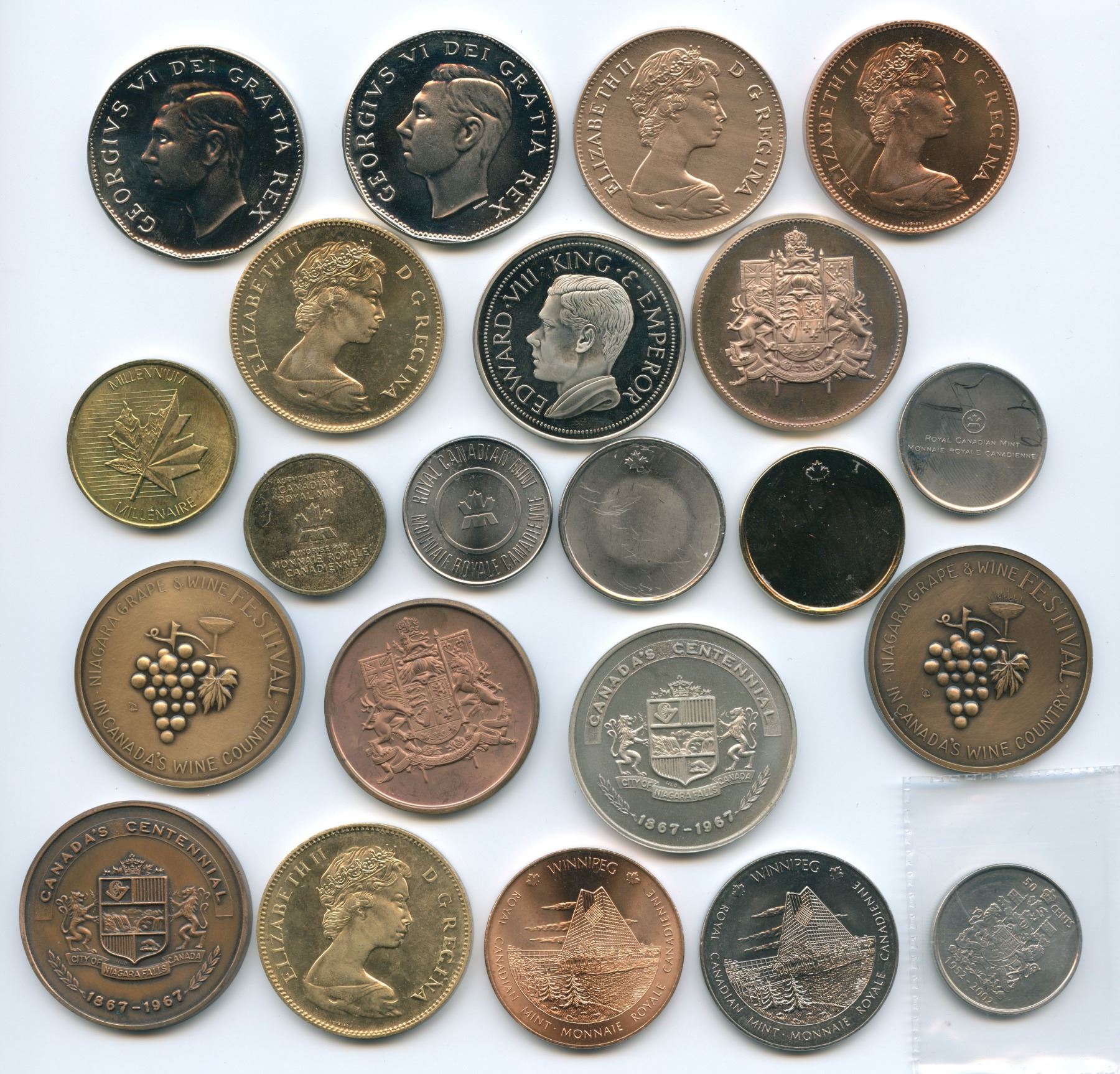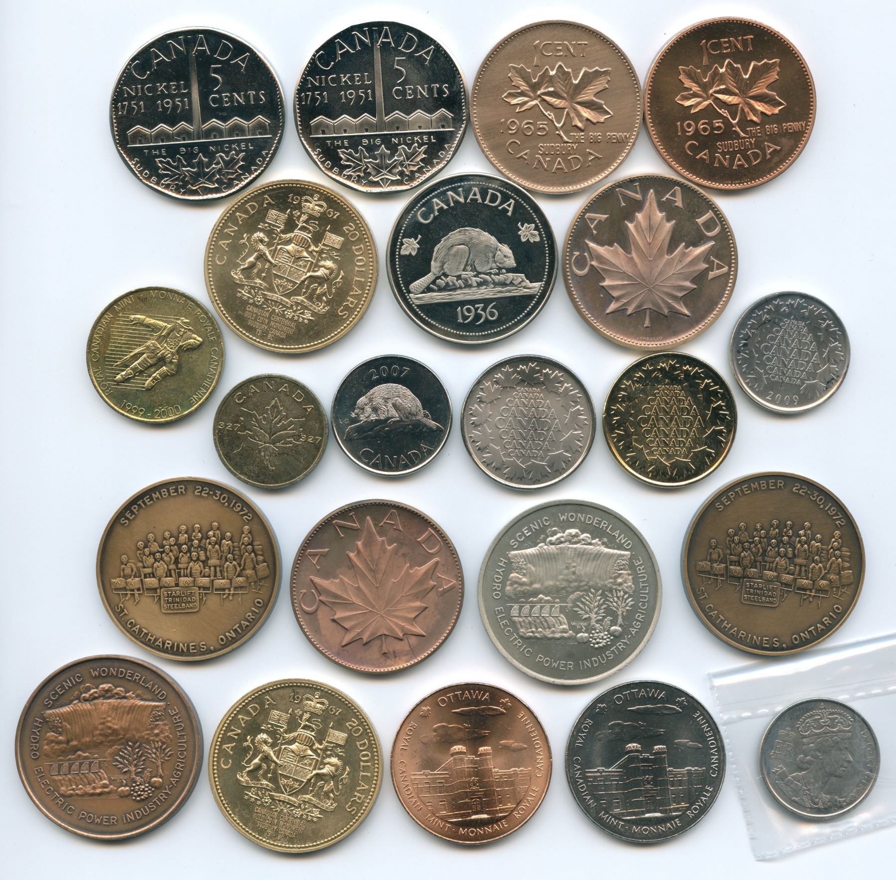 1951 Big Nickel, Types I and II, with and without Lombardo, both mint BU. 1965 Big Penny, Sudbury in copper and Aluminum (very scarce), both BU. Gold-plated 1967 Gold Monument of 20 Dollars x2. 1936 Fantasy medallion. Canada Coat of Arms bronze medallion, BU. St. Catharines, Ontario medallions, RCM tokens, etc. 22 pieces.