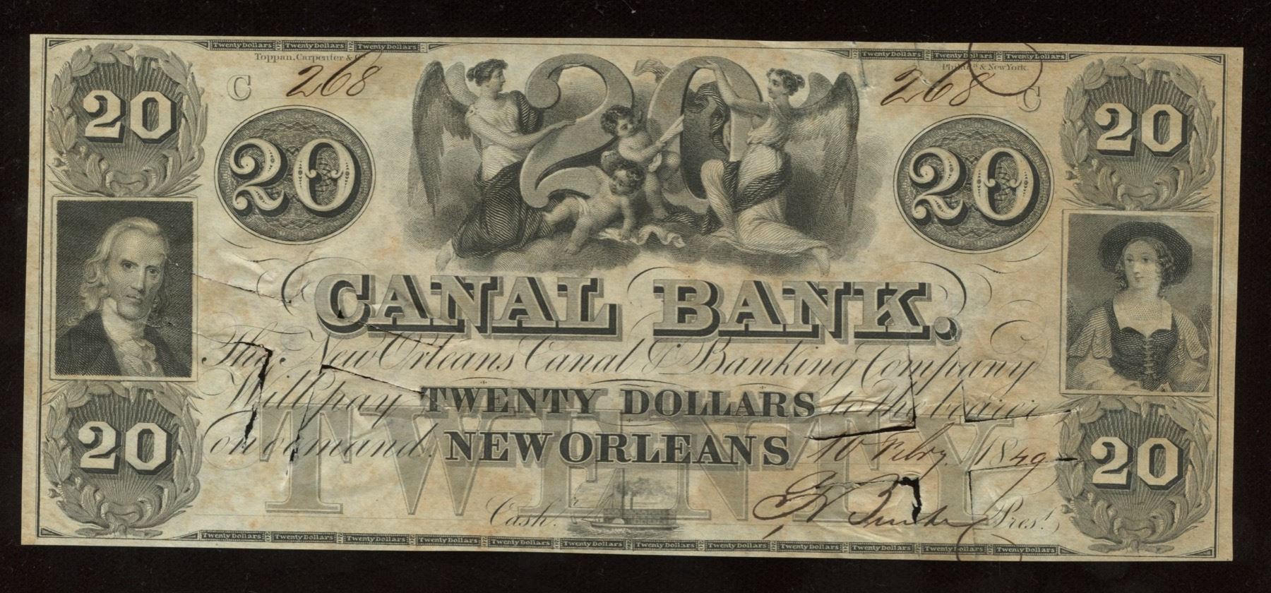 It is unusual to see an issued/cancelled example of this 1849 Canal Bank $20 note. Overall condition is good and the note has been slit cancelled. Note is back-printed with a bold red decorative denomination vignette. A nice find for any currency collector.