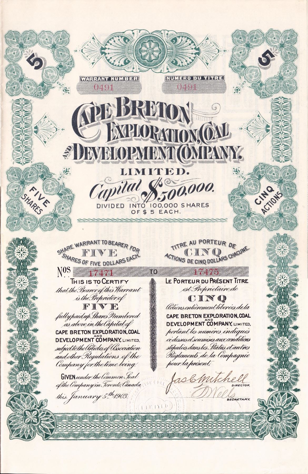 This exceptionally rare stock certificate for the "Cape Breton Exploration, Coal and Development Company" dates to 1903 and is signed by company executives in Toronto. It is one of only three examples known to exist, per Coxrail! A beautiful and rare Canadian certificate in excellent condition. Issued and uncancelled.