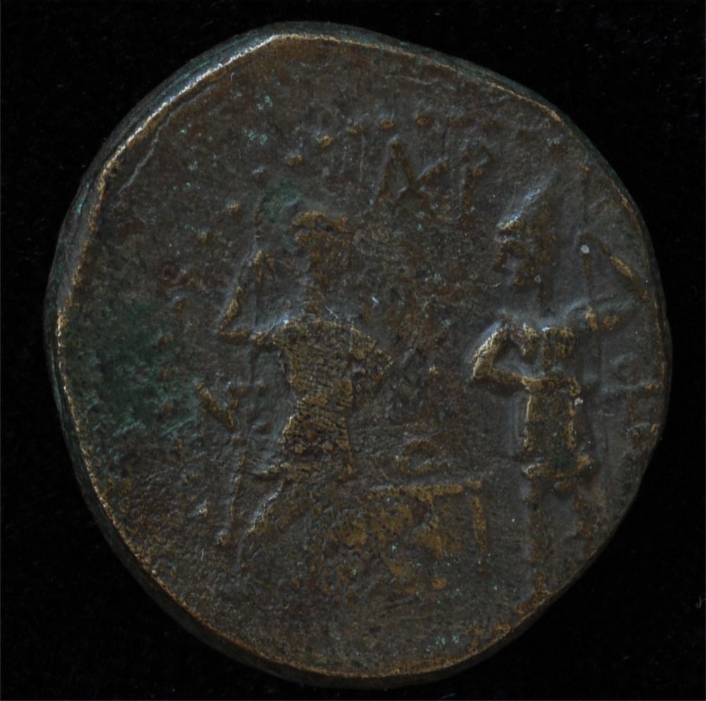 Chalkis sub Libano (85-40 BC) - AE-20 Coele, Syria Obv: Helmeted head of Athena r., oval counter stamp fo Cleopatra VII Rev: The Dioscouri facing with monograms 5.4 grams Lingren III 1231f Fine.