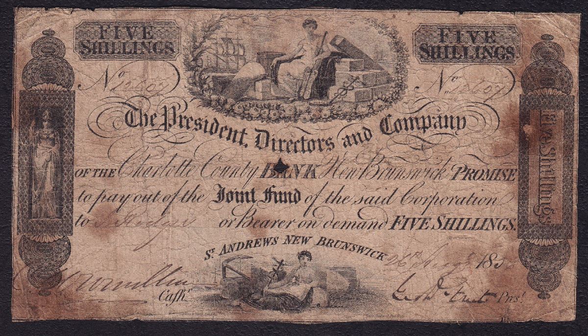 Charlotte County Bank. St. Andrews, New Brunswick. Five Shillings, 26 Aug. 1856