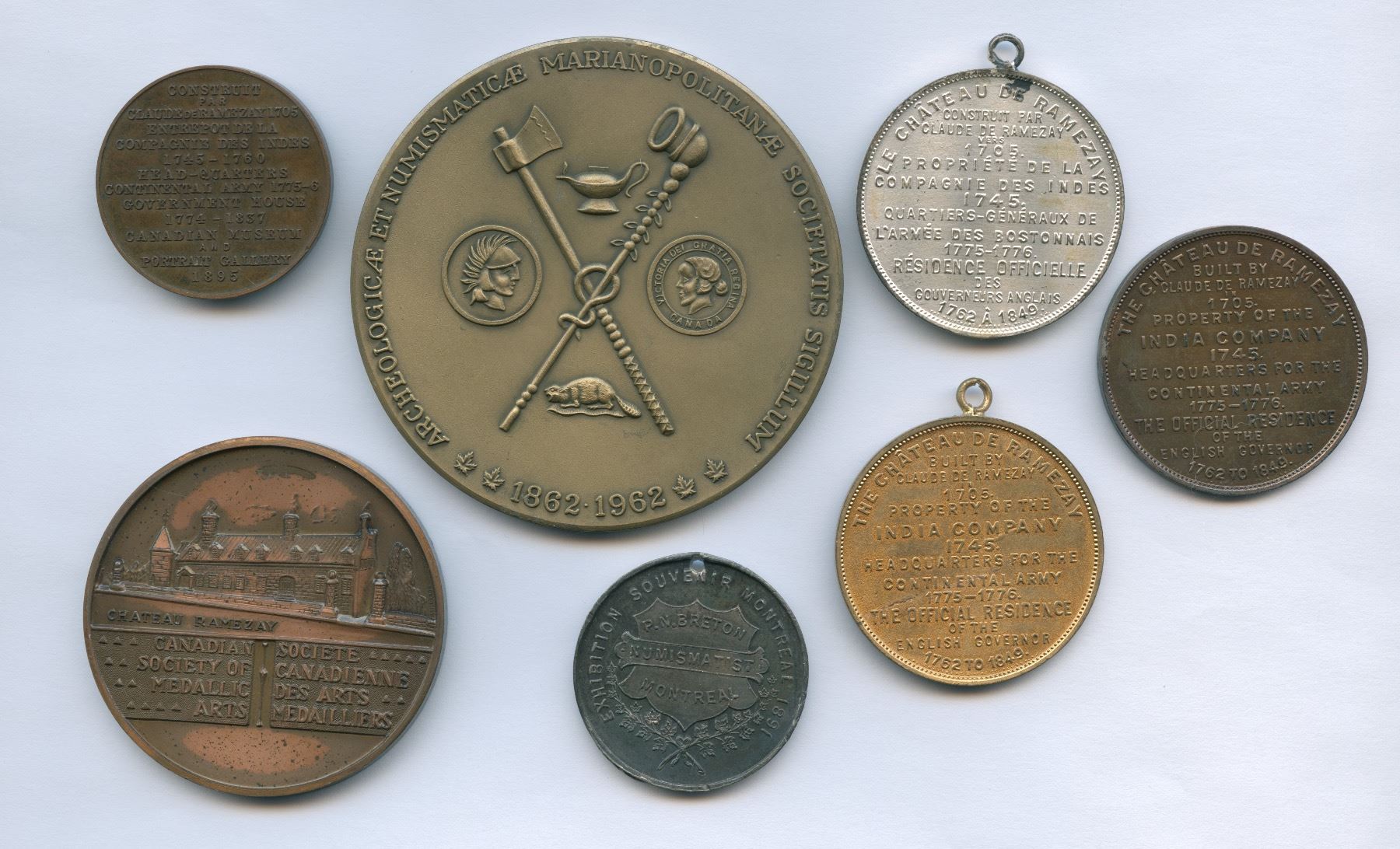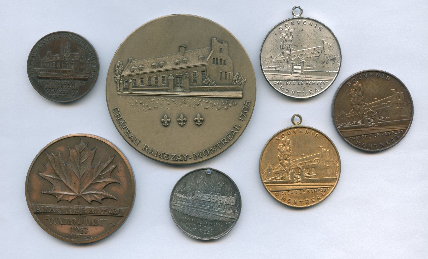 Includes: 1) 1849 Souvenir Trio Chateau de Ramesay, Montreal. 37mm, brass, copper, & WM, produced by Whitehead and Hoag, N.J. 3 pcs. 2) 1891 Exhibition Souvenir Montreal, Chateau de Ramezay P.N. Breton. WM, holed at 12:00, 33mm, Br 169, Leroux 1517a. 3) 1705-1906 Chateau de Ramesay Bicentenary, copper, 33.1mm, produced by Caron Freres in Montreal. 4) 1862-1962 Montreal Society of Archeology & Numismatic 100th Anniversary, bronze, 69mm, produced by William Scully of Montreal, mintage of 100. 5) 1963 Maple Leaf A Mari Usque Ad Mare Chateau Ramezay, produced by Lombardo Mint, copper, 51mm, 65.17 gms. 7 pcs.