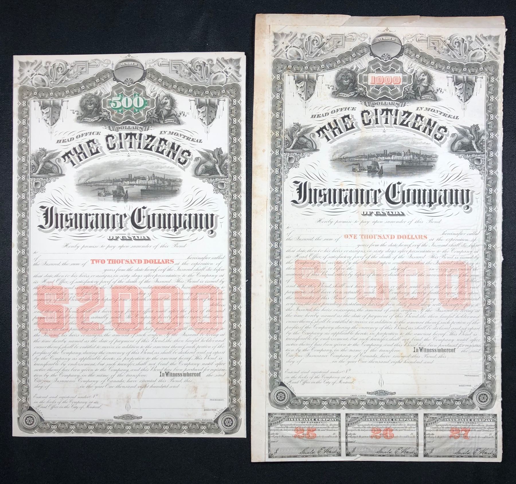 Citizens Insurance Company of Canada, $2,000 Bond, proof, mounted on card. Printed by Canada Bank Note Co. in black with red tint; an inappropriate green 500 counter is pasted over the red counter at top. Vignettes include Royal Crest, gryphons and city waterfront, "View of Montreal". A second proof, similar but $1,000, mounted on card, with thirty interest coupons attached. The first in excellent condition but for some quite minor soiling, the second with some tears etc. but overall still quite nice.