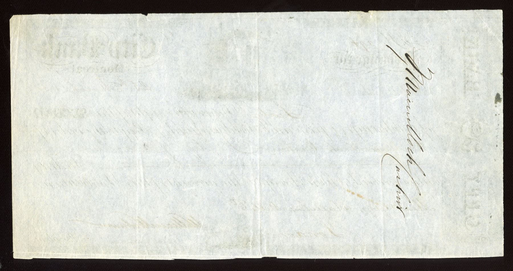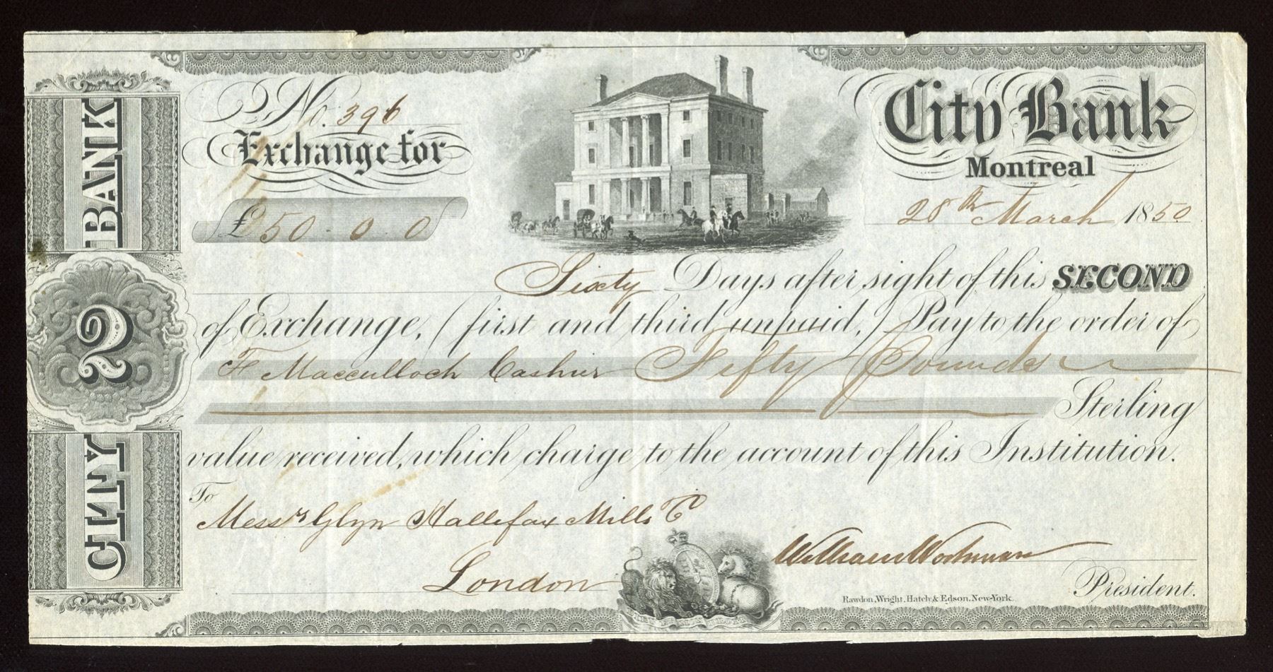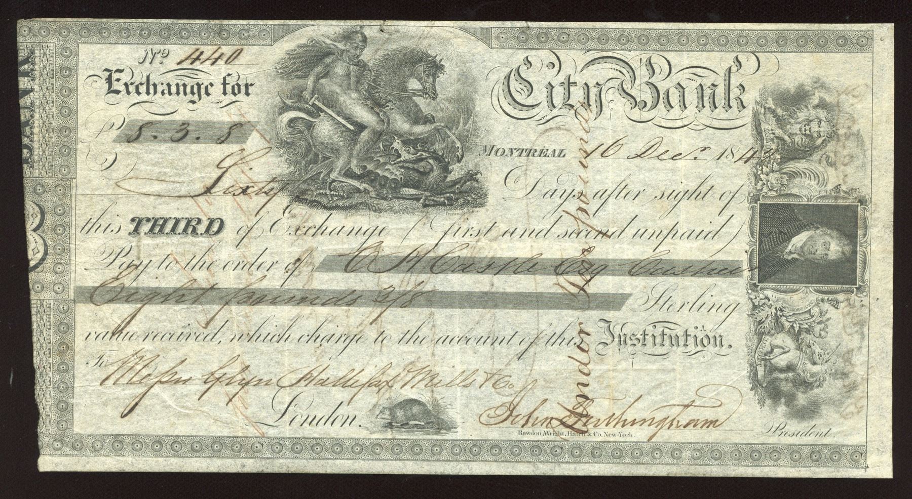 City Bank, Montreal, Bill of Exchange 1842, with vignettes as seen on notes of the bank's first issue, Rawdon, Wright & Hatch imprint; also a Bill of Exchange 1850 with entirely different vignettes, including the bank building featured on second issue notes, Rawdon, Wright, Hatch & Edson imprint.