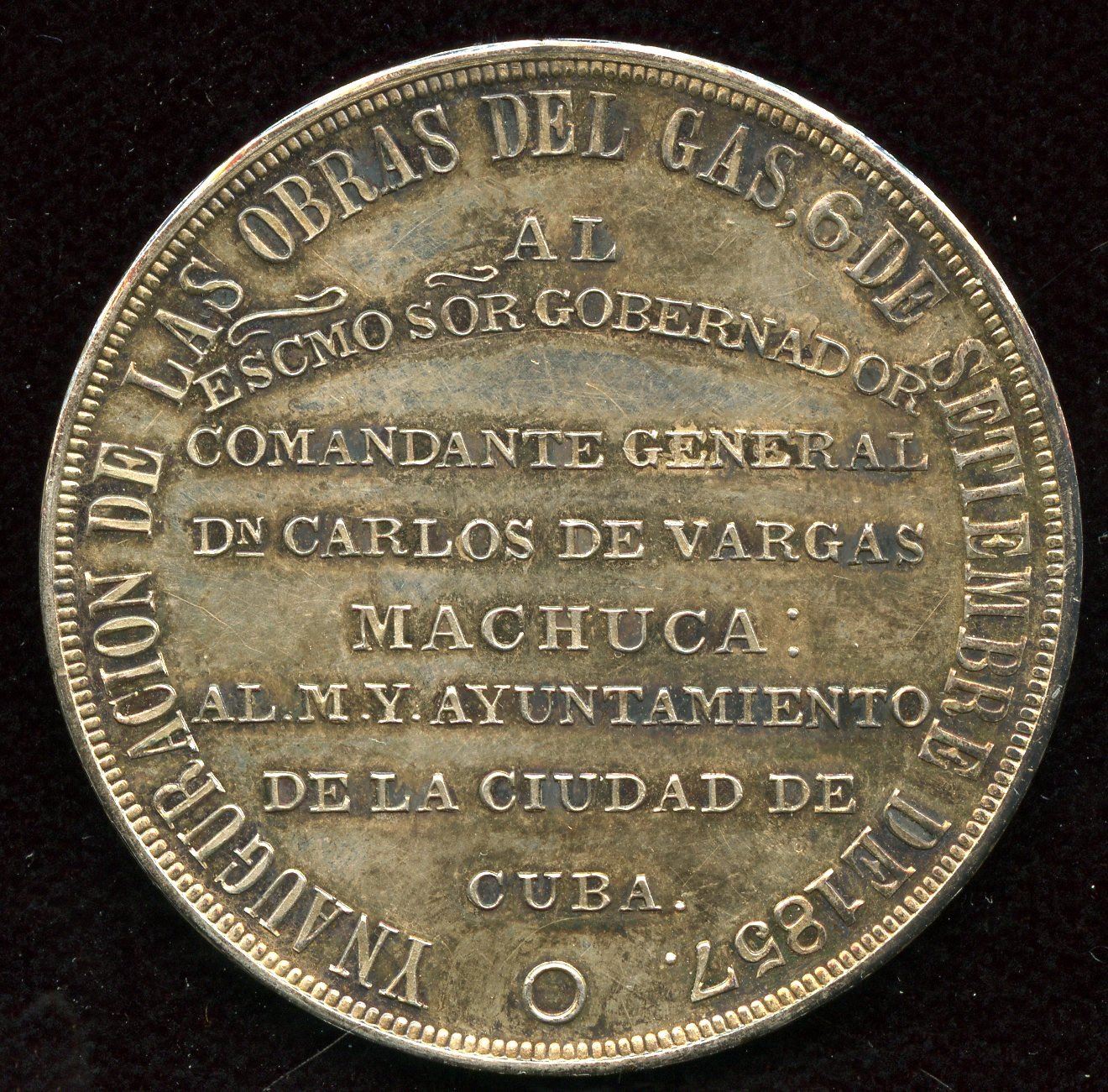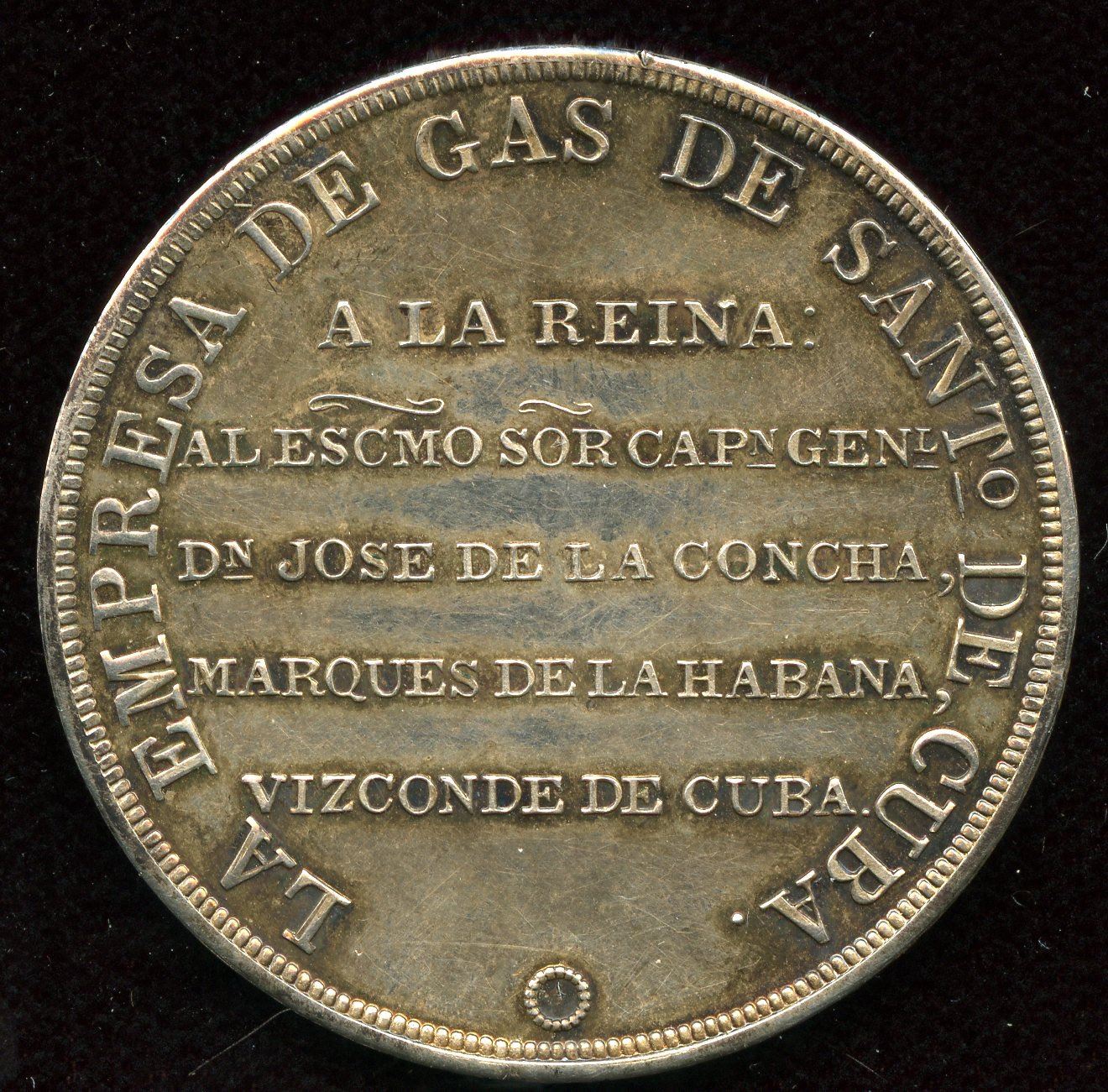 AR, 23.3 gms. Medal to commemorate the gas industry opening of facility in Santiago, Cuba. Opened by Jose Gutierrez De La Concha. 1st Marquis of Havana. 1st Viscount of Cuba. Captain General of Cuba (3 terms). Cased.