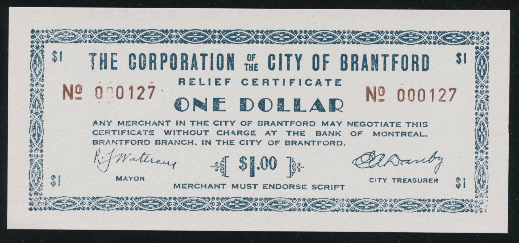 DE-010-1d. Charlton states "The original plate for the $1.00 Brantford scrip survives, and has been used to print reproduction notes in blue, not issued colour, with red serial numbers and lacking underprinting", and this is one of those examples.