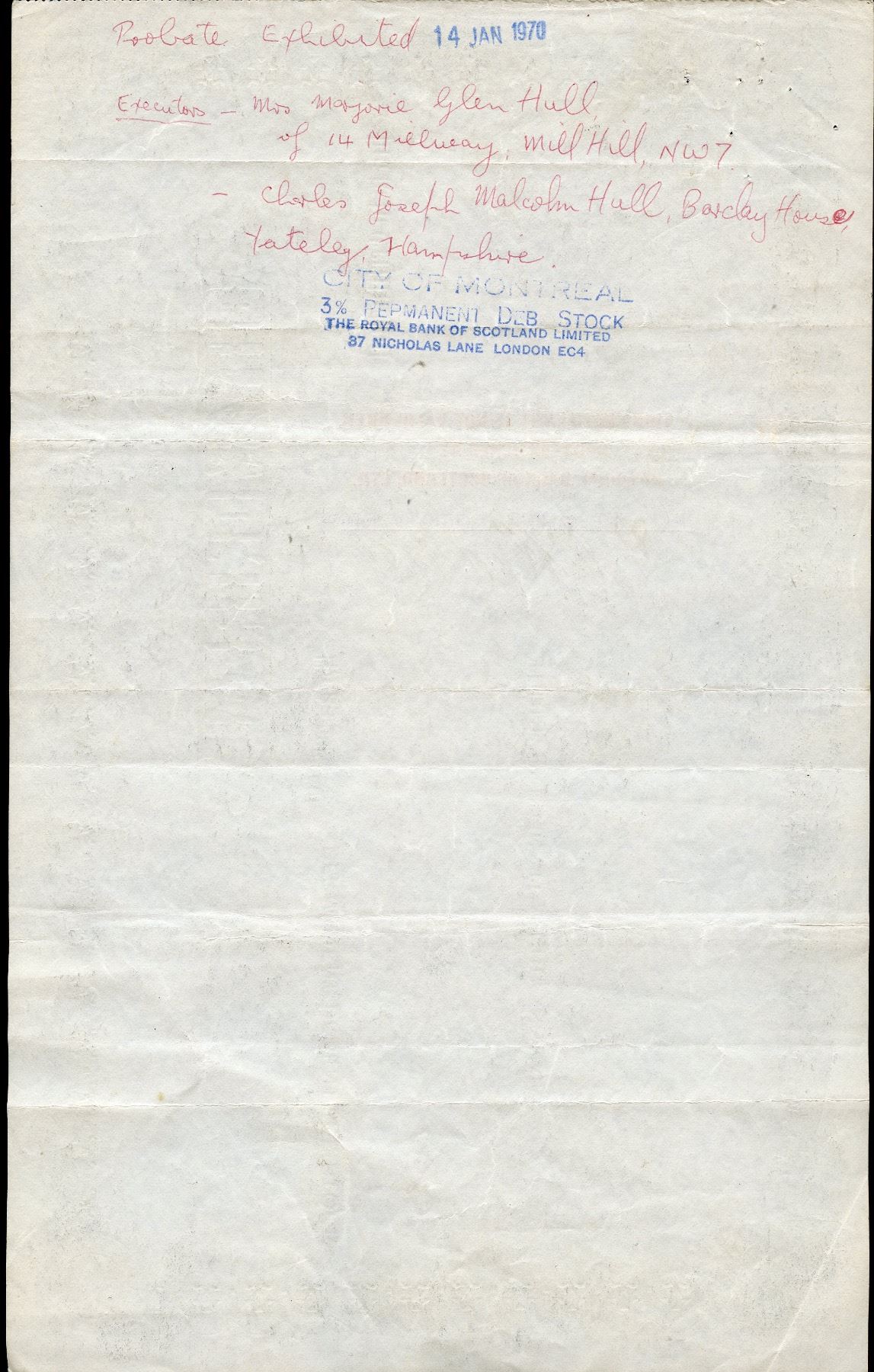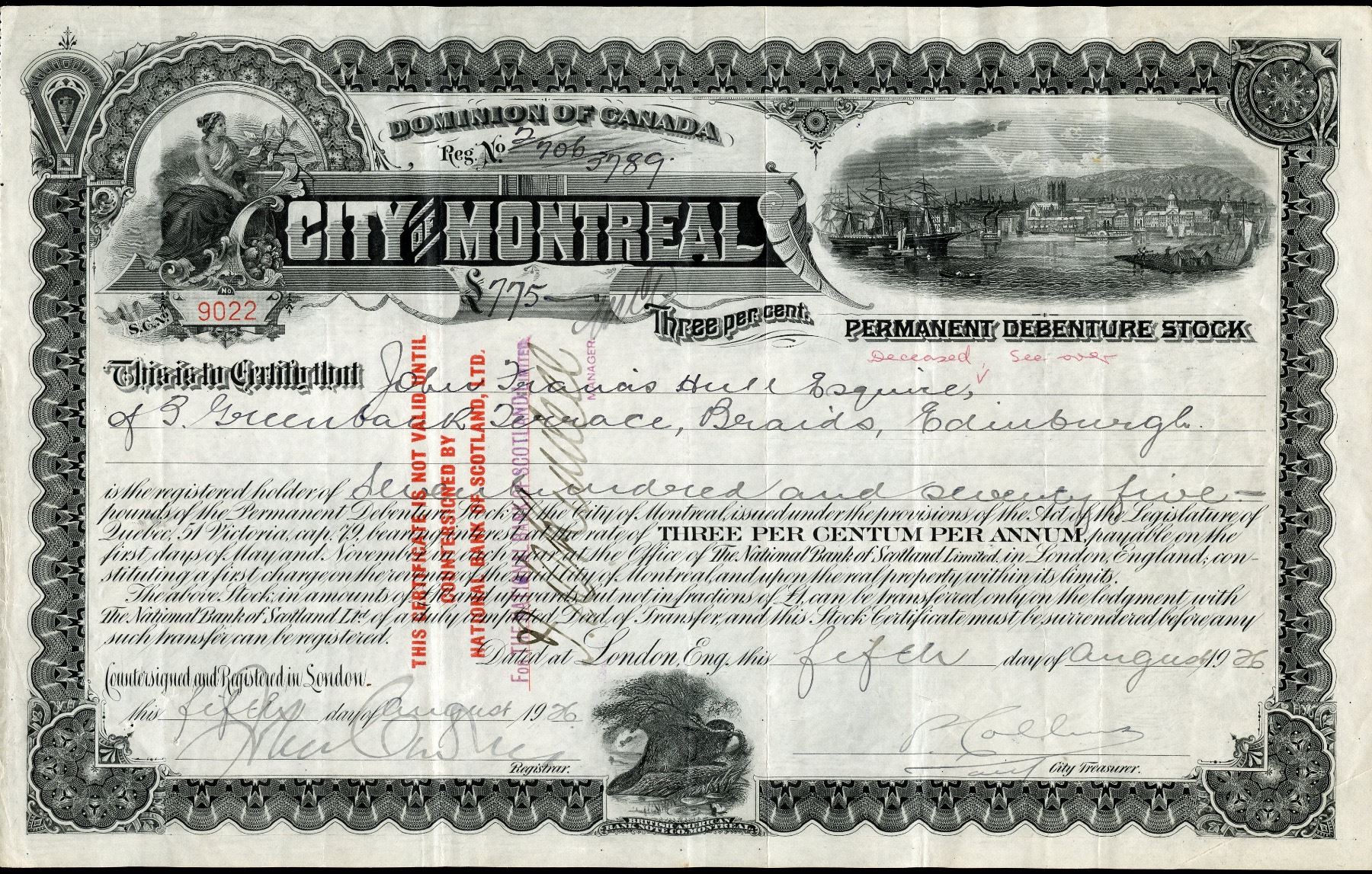 Debenture stock for 775 pounds issued to John Francis Hull in 1926. A beautiful vignette of the City of Montreal, UNC. S/N 9022