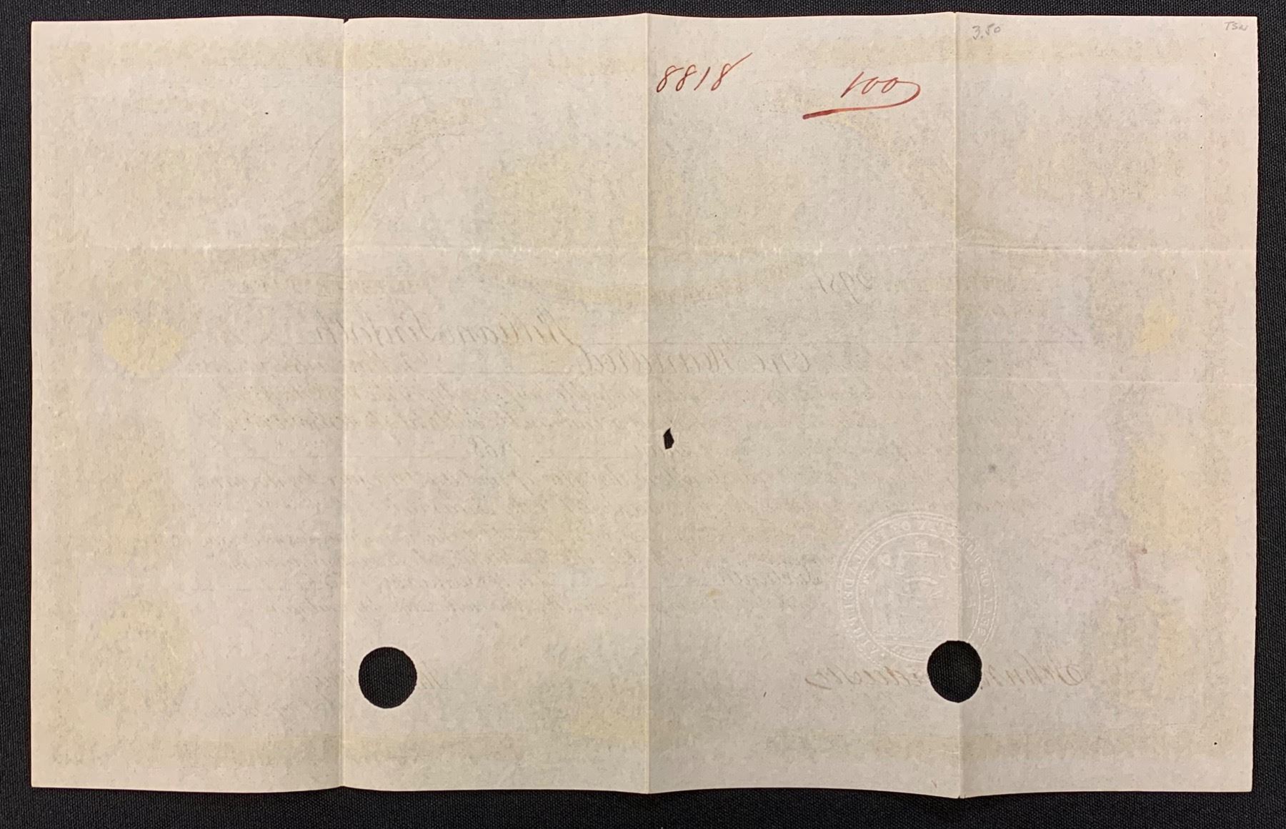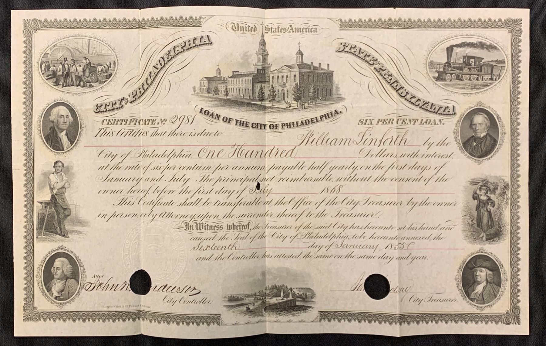 intaglio printed by Draper, Walsh & Co. Adorned with no fewer than ten vignettes! City seal is embossed at lower left. Folded, hole punch cancelled, spindle hole near centre, but still an attractive historic document.