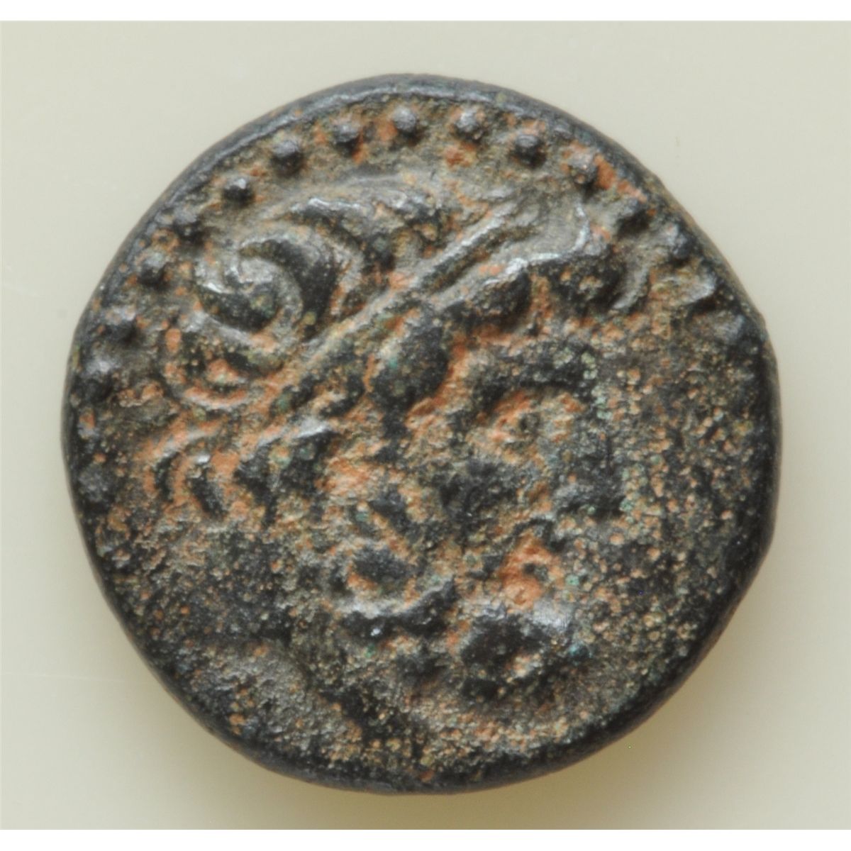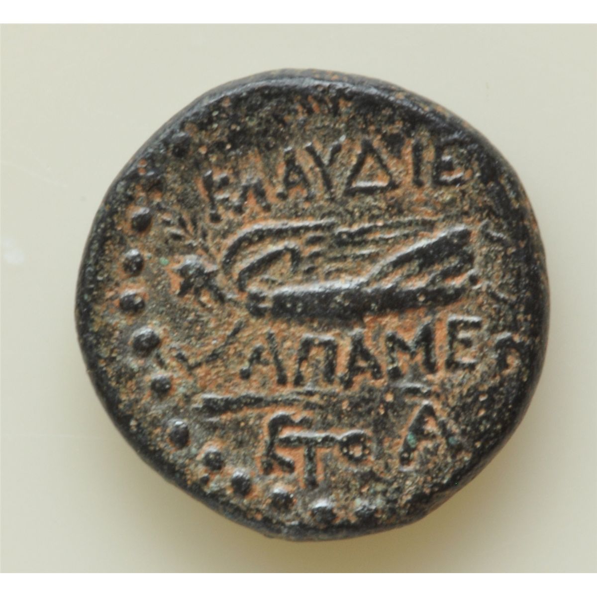 Claudius (41-54AD) - AE-18 Apamea, Syria Obv: laur. hd of Zeus r., Rev: Nike advancing l., holding palm and wreath KLAUDIEWN APAMEWN ETO A. 5.3 grams RPC-4376. EF.