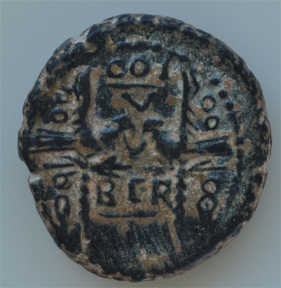 Claudius (41-54AD) - AE-23 Berytos, Phoenecia Obv: Laur. hd. r., TI CLAVD legend Rev: Two legionary eagles facing between two standards for legions V and VIII COL BER. 7.7 grams RPC-4547 Var. Fine.