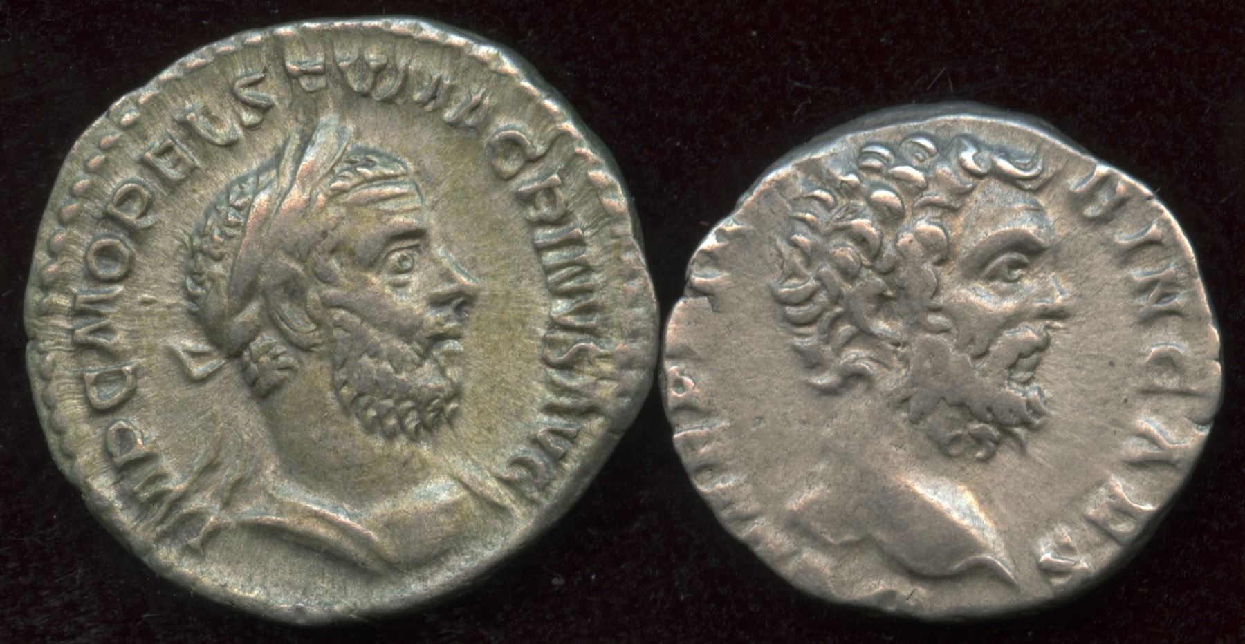 Clodius (2.85g) Rev: Roma seated l. on shield holding palladium and sceptre. RIC 11a; VF || Macrinus (3.18g) Rev: Jupiter stg. l., holding thunderbolt and long sceptre. RIC 72; VF, soft reverse.