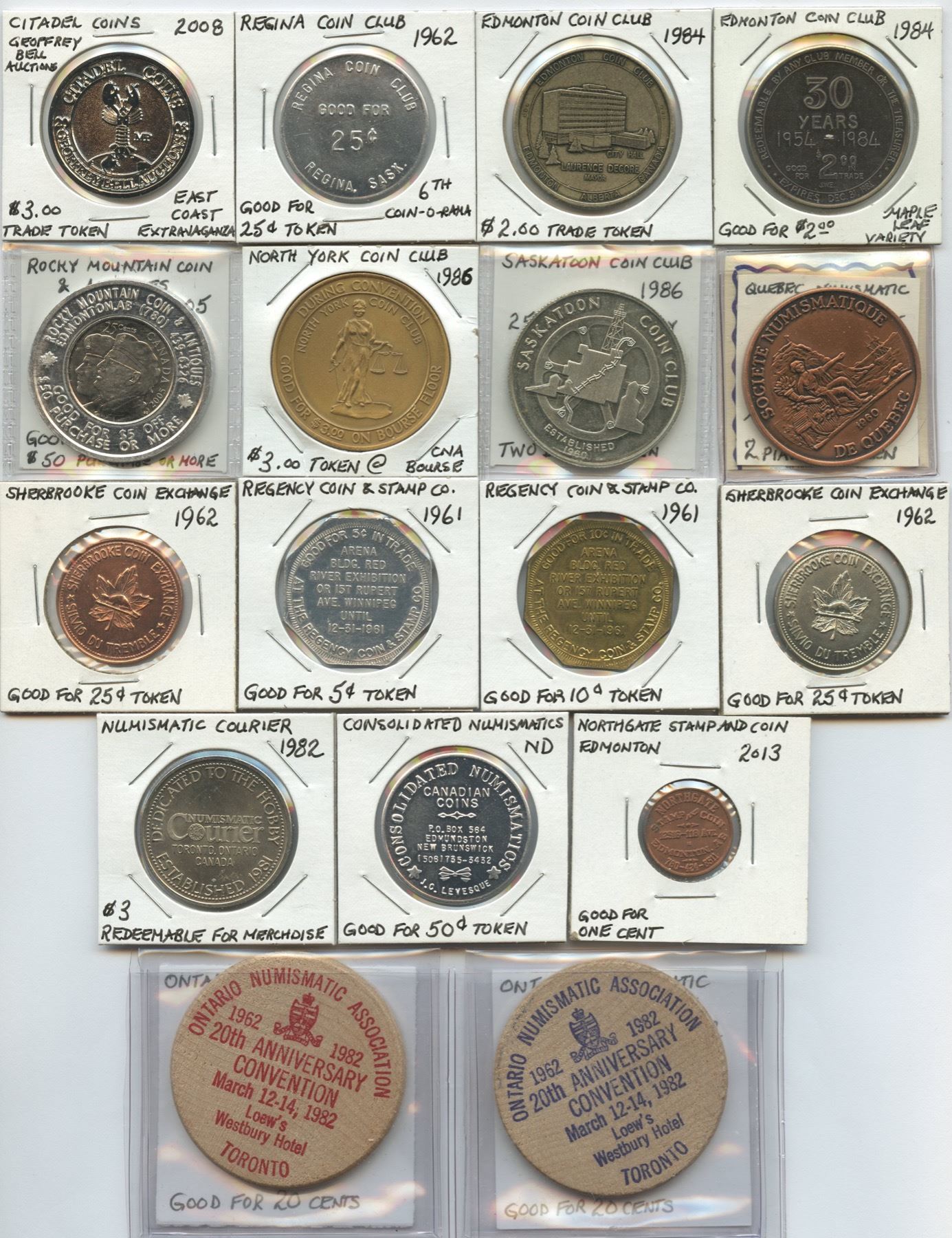 Various ONA (Ontario Numismatic Association) tokens, coin club tokens & Dealer / Merchant tokens. Variety of issues dating mainly 1960's to 2000's. Includes Sherbrooke, Edmonton, North York, Regina, Saskatoon, Ontario & Quebec. 17 Pcs.