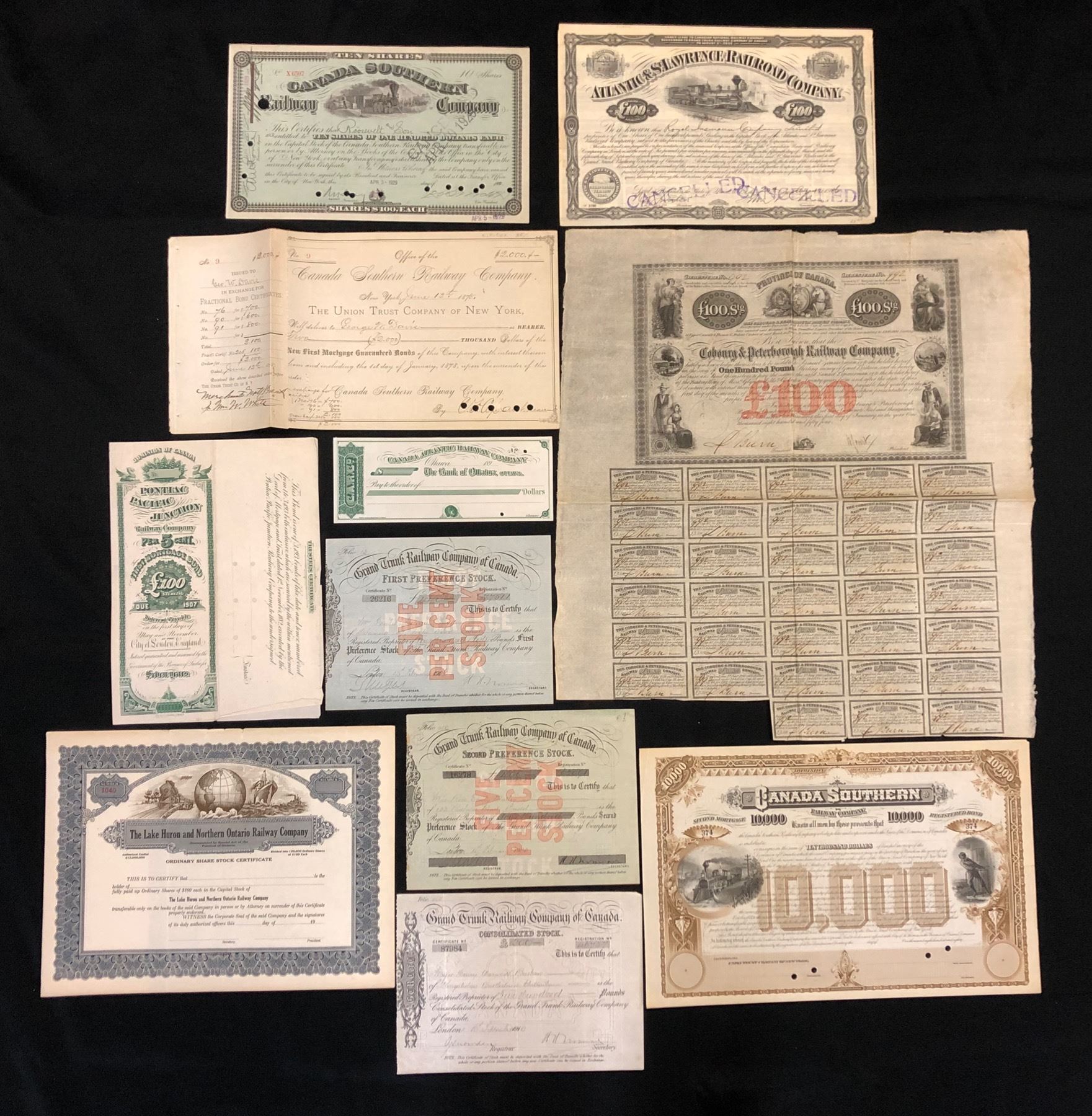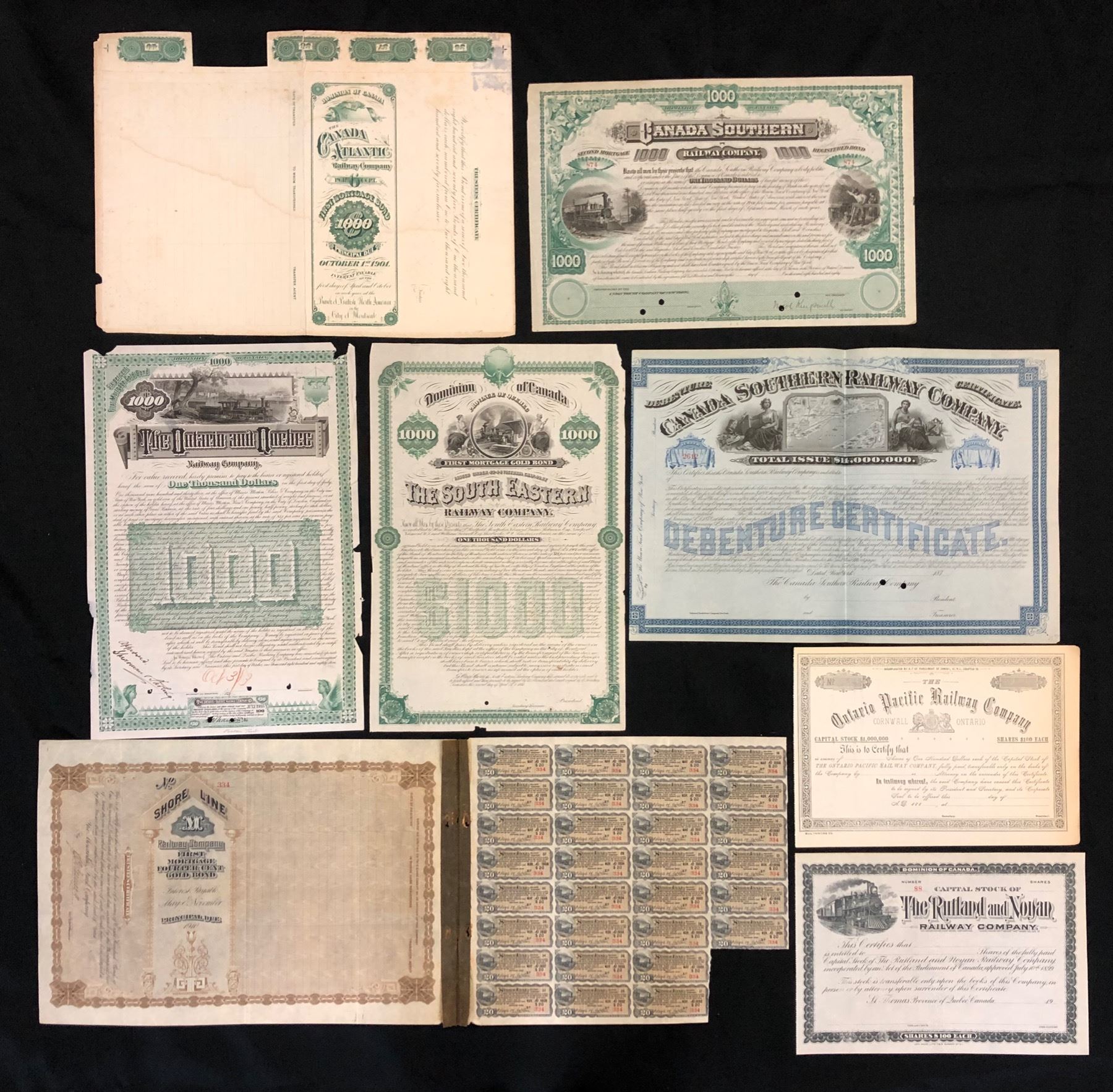 Collection of Railway Financial Documents. Ontario and Quebec Railway Co., 6% First Mortgage Bond, 1883, approval proof, moderate edge damage. Shore Line Railway Co. 4% First Mortgage Bond, with 30 interest coupons remaining, few rust spots at top. Canada Atlantic Railway Co., back of 6% First Mortgage Bond, proof, on card, pieces cut away; also a cheque on Bank of Ottawa, 189_, unused. South Eastern Railway Co., First Mortgage Bond, 1881, proof, moderate edge damage. Canada Southern Railway Co., Second Mortgage Bond, 188_, remainder with punch cancels but quite nice condition; also a Stock Certificate issued in 1929, a Debenture certificate, unissued, 187_; an agreement to deliver $2,000 in first mortgage bonds, 1878; and finally, a $10,000 Second Mortgage Bond, 1880, unused. Rutland & Noyan Railway Co. unissued document, 19__, conveying entitlement to shares. Ontario Pacific Railway Co., unused Share Certificate, 188_. Lake Huron & Northern Ontario Railway Co. unused Share Certificate, 19__. Grand Trunk Railway Co. Consolidated Stock certificate, 1910; First Preference Stock Certificate 1906; Second Preference Stock Certificate 1903. Atlantic & St. Lawrence Railroad Co. Stock Certificate, 1926. Pontiac Pacific Junction Railway Co. 5% First Mortgage Bond, proof of back only, a few small tears. Cobourg & Peterborough Railway Co., £100 Debenture, issued, 1854, with thirty-three interest coupons remaining. An RWHE document with eight vignettes! Nineteen items, many illustrated with train vignettes.