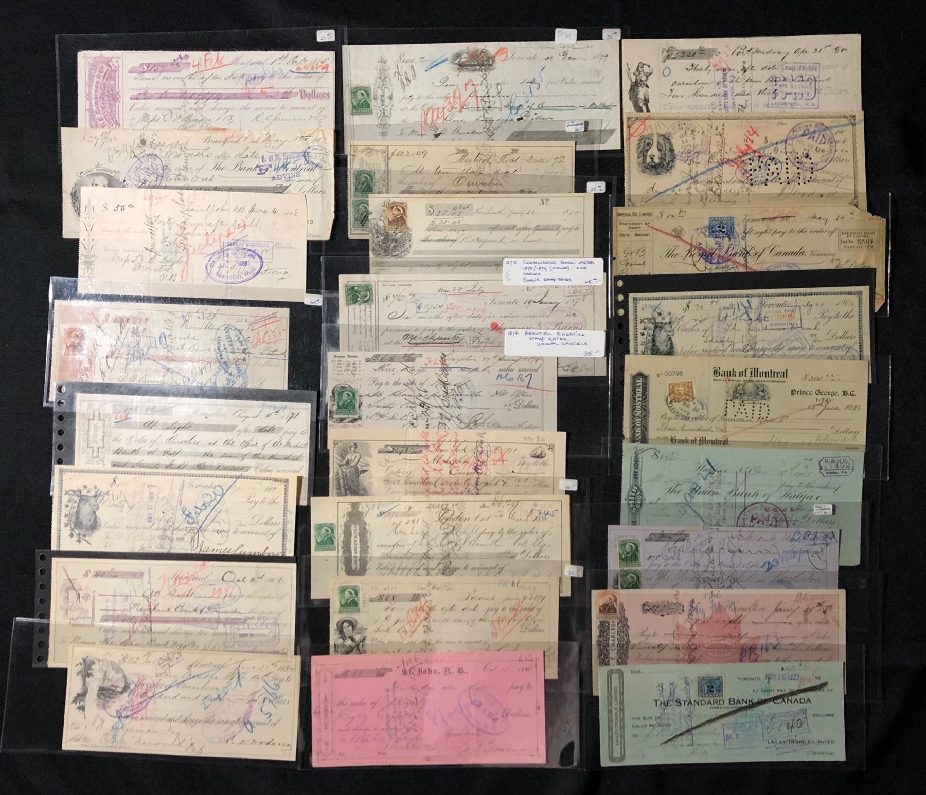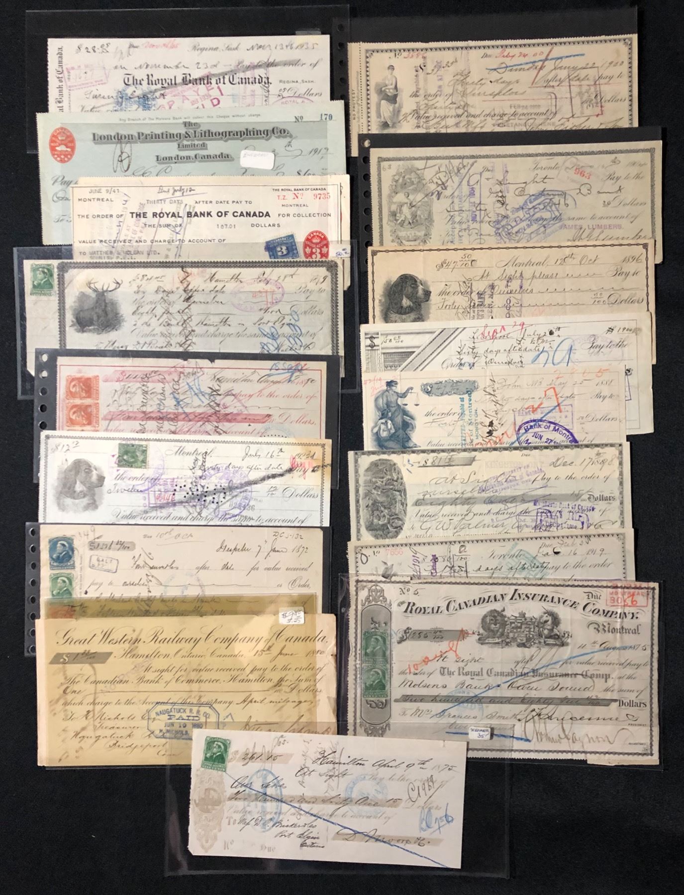 Collection of drafts, dates run 1871 to 1941, most have a vignette (including one with a portrait of Lord Roberts); various bank rubber stamp impressions including Royal Canadian Bank, Western Bank of Canada, Consolidated Bank of Canada, Union Bank of Halifax, Ontario Bank and St. Stephens Bank. A number of these drafts have bill stamps affixed. Many are in sleeves showing prices up to $45 each. Forty-four drafts.