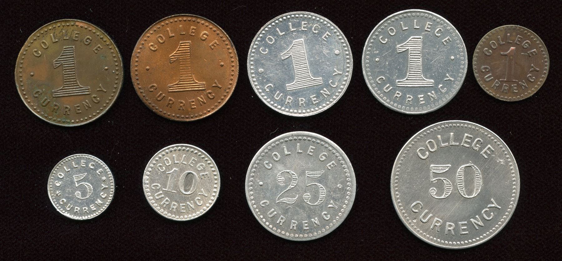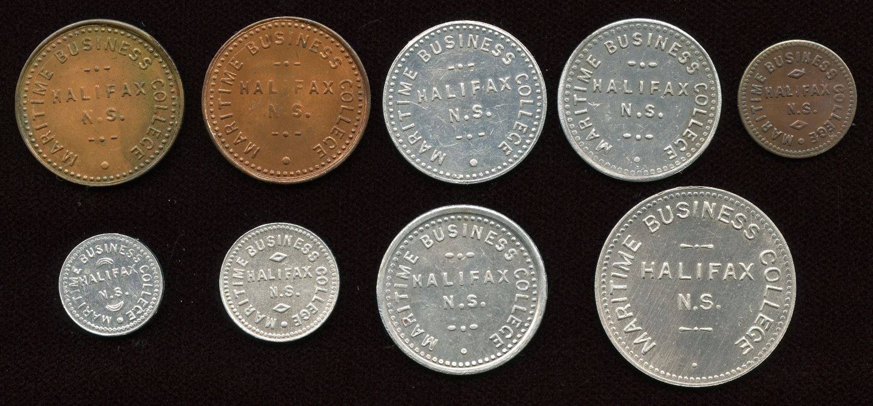 Lot of Nine Maritime Business College, Halifax, N.S. Tokens. Large 1, copper, EF; Same as previous but, Unc; Same as previous but, Aluminum, EF, Same as previous; Small 1, copper, AU; 5, Aluminum, EF; 10, Aluminum, EF; 25, Aluminum, EF; 50, Aluminum, EF. 9 pcs.