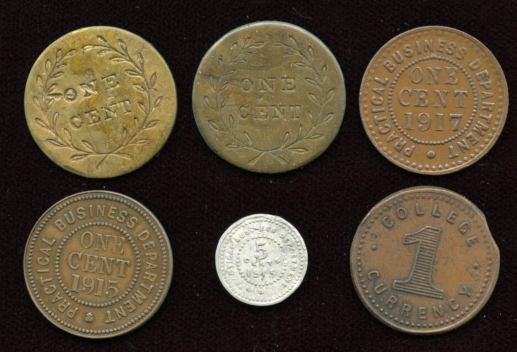 Mt. St. Louis Institute, One Cent, Brass, incused, VF; College de Hull, One Cent, Brass, incused, VF; Academie St. Savveur, One Cent 1917, Copper, VF; Commercial Academy, One Cent 1915, Brass, VF; Same as previous but 5 Cents, Aluminum, F; Maritime Business College, Halifax, Copper, VF, 1 Currency. 6 Pcs.
