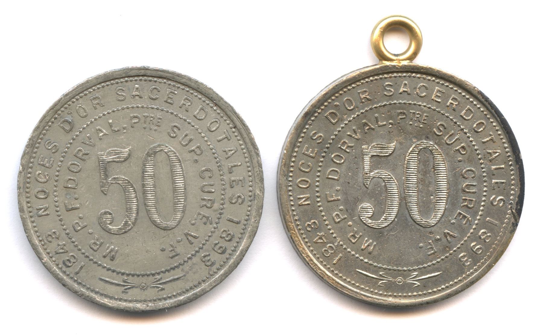 Lot of two (2) pieces. Each 31.0mm with plain edges and unsigned. 1.) White metal. 9.20g. No hanger. Faint evidence of wear, but otherwise bold. 2.) Gilt white metal, though most of the gilding has faded. 9.26g. Hanger for suspension at 12 o’clock. A similar example was included in the Joffre Collection.