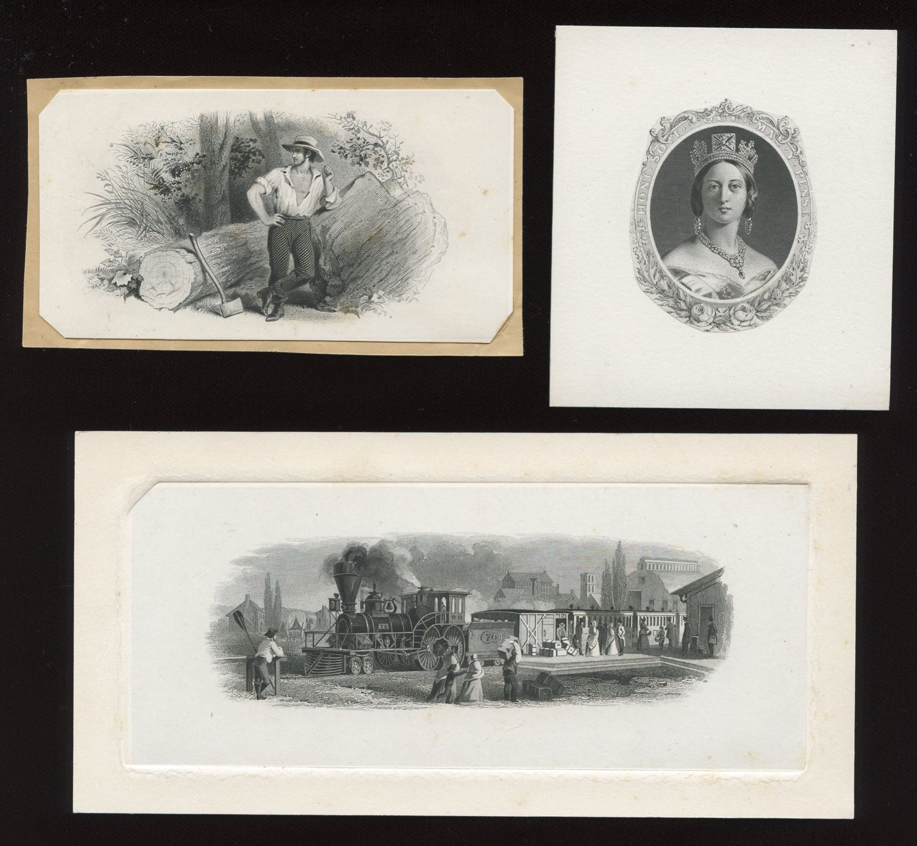 Colonial Bank of Canada, five die proof vignettes. Woodsman on $1, cut down; girl on $2 and Cornelia Jocelyn on larger cards; Queen Victoria after Winterhalter, in frame; and train on $10.